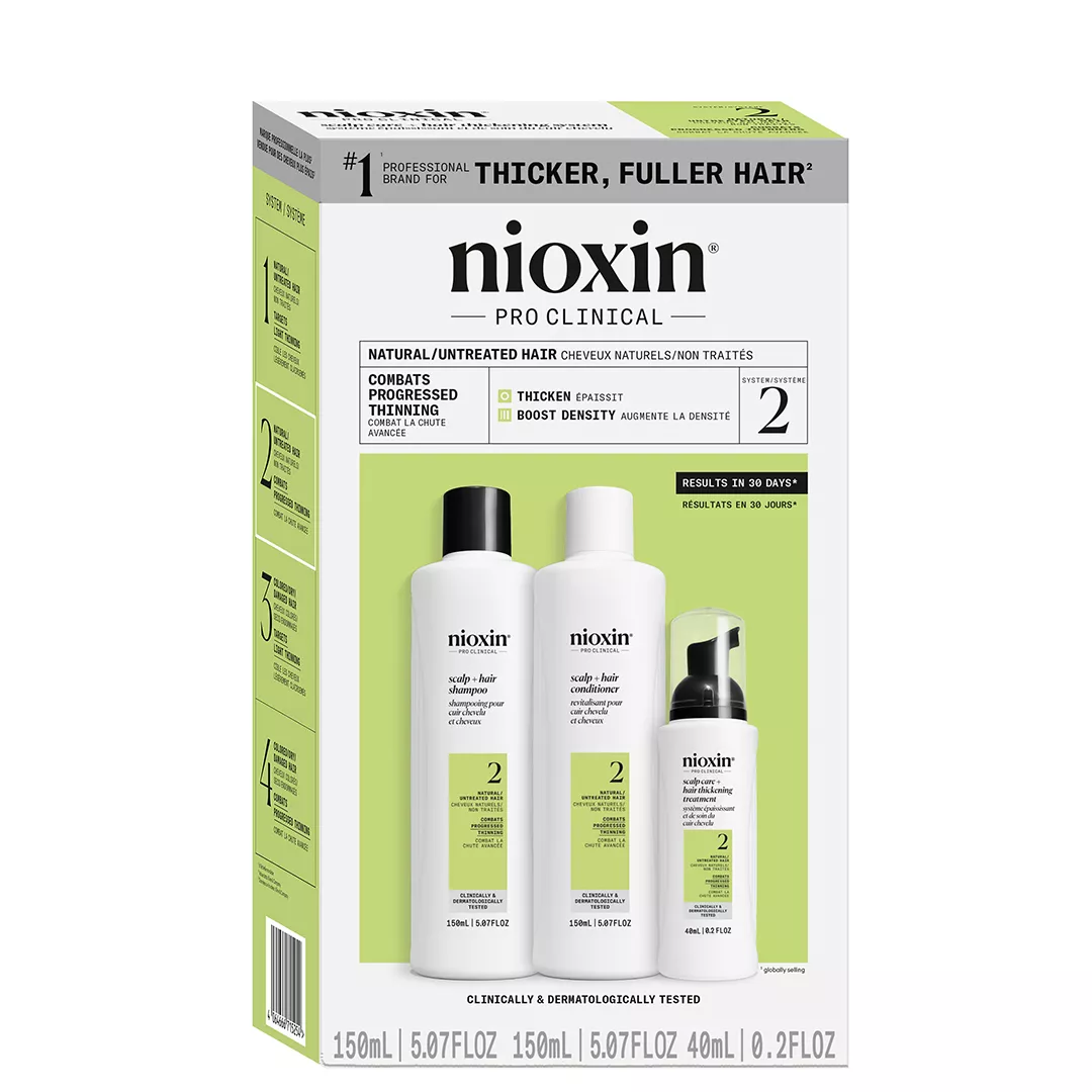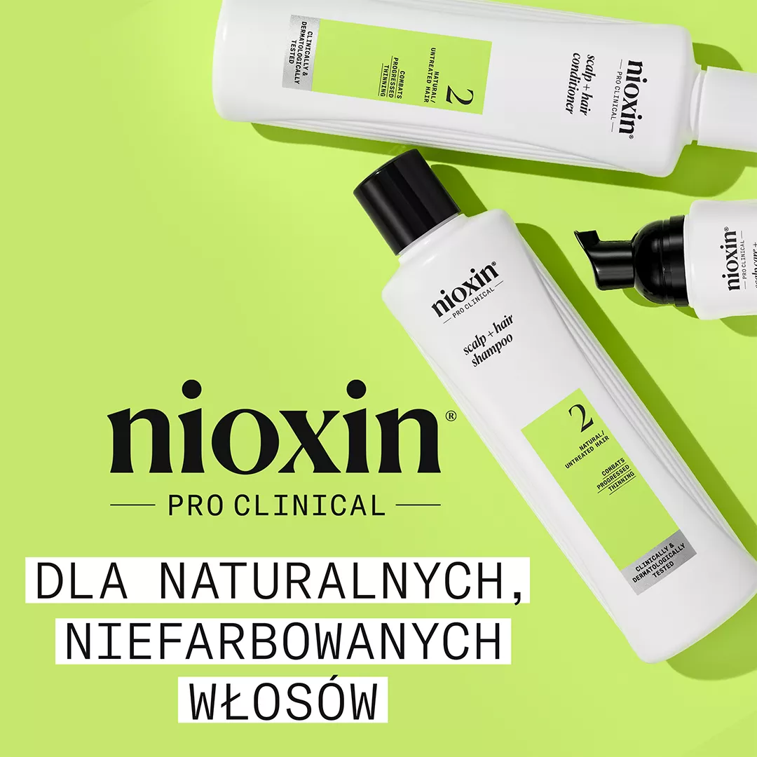 Poznaj Nioxin System 2 – profesjonalny zestaw oczyszczający do włosów naturalnych, mocno przerzedzonych. To innowacyjna, 3-stopniowa kuracja, która powstała z myślą o osobach zmagających się z intensywnym przerzedzaniem i utratą gęstości włosów. Dzięki ponad 30-letniemu doświadczeniu w pielęgnacji włosów cienkich, marka Nioxin oferuje skuteczne rozwiązanie, które widocznie wzmacnia, pogrubia i odświeża zarówno włosy, jak i skórę głowy. Efekty możesz zauważyć już po pierwszym użyciu, a regularna pielęgnacja sprawia, że aż 85% użytkowników potwierdza wyraźne pogrubienie włosów po 30 dniach stosowania.*
