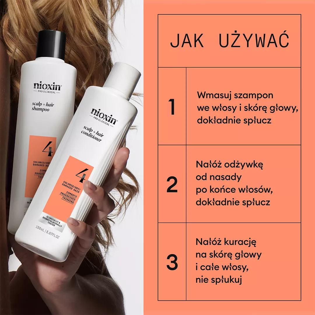 - Umyj włosy szamponem Nioxin System 4 i dokładnie spłucz.