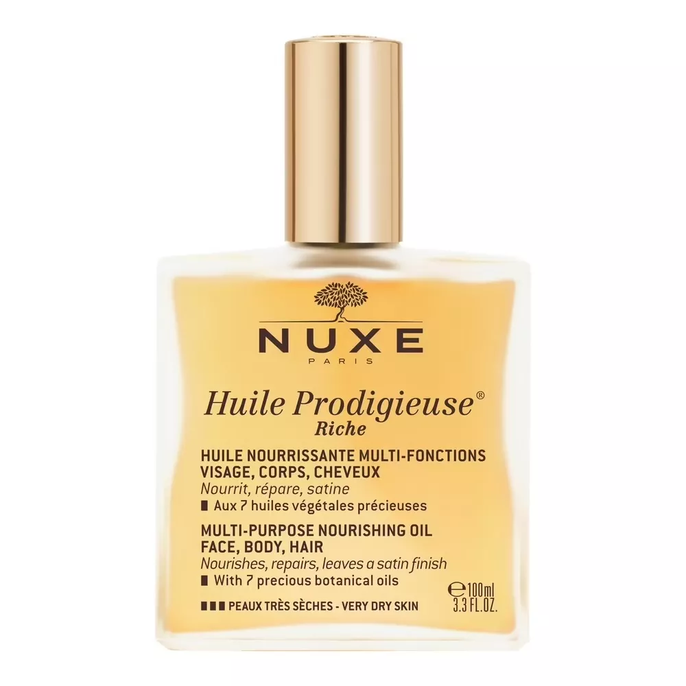 Wzbogać swoją codzienną rutynę pielęgnacyjną o Nuxe Huile Prodigieuse Riche i ciesz się jedwabistą, nawilżoną skórą oraz lśniącymi włosami przez cały rok.