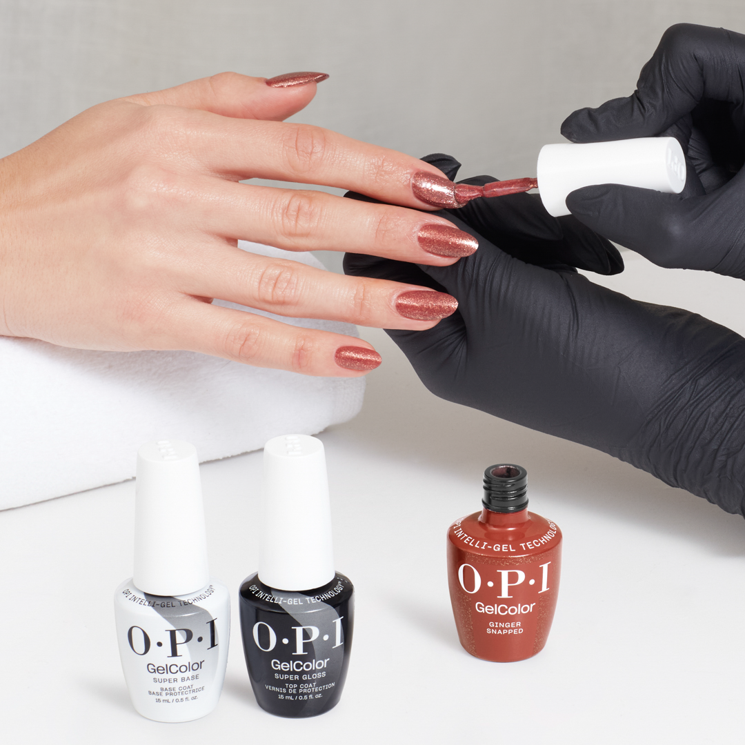 - Wstrząśnij buteleczką lakieru hybrydowego OPI GelColor Ginger Snapped i nałóż cienką warstwę koloru, pamiętając o zabezpieczeniu krawędzi. Utwardzaj przez 30 sekund.