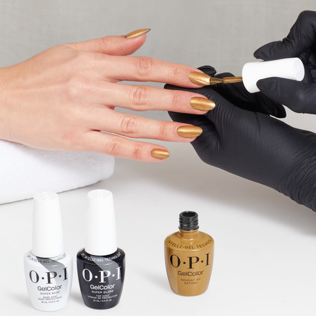 - Wstrząśnij buteleczką OPI GelColor Super Gloss Top Coat przez 1 minutę, nałóż cienką warstwę topu i utwardzaj przez 30 sekund.