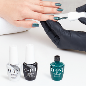 - Wstrząśnij buteleczką OPI GelColor Super Gloss Top Coat przez 1 minutę, nałóż cienką warstwę topu i utwardź przez 30 sekund.