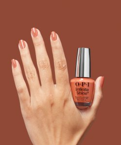 Krok 3: Zaaplikuj dwie cienkie warstwy lakieru OPI Infinite Shine Knee High Stock-blings, zabezpieczając wolny brzeg przy każdej warstwie. Każdą warstwę pozostaw do wyschnięcia na 1-2 minuty.