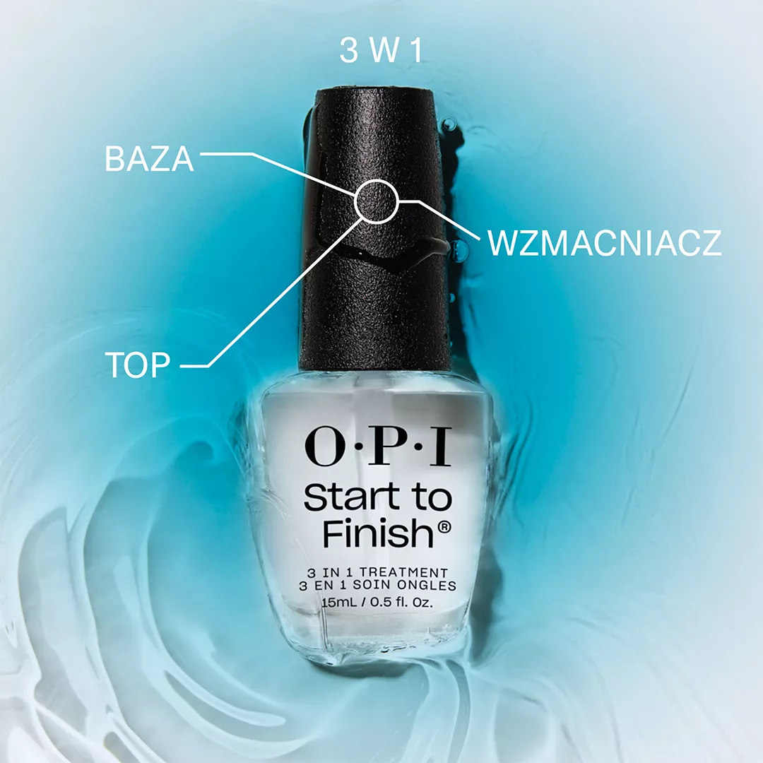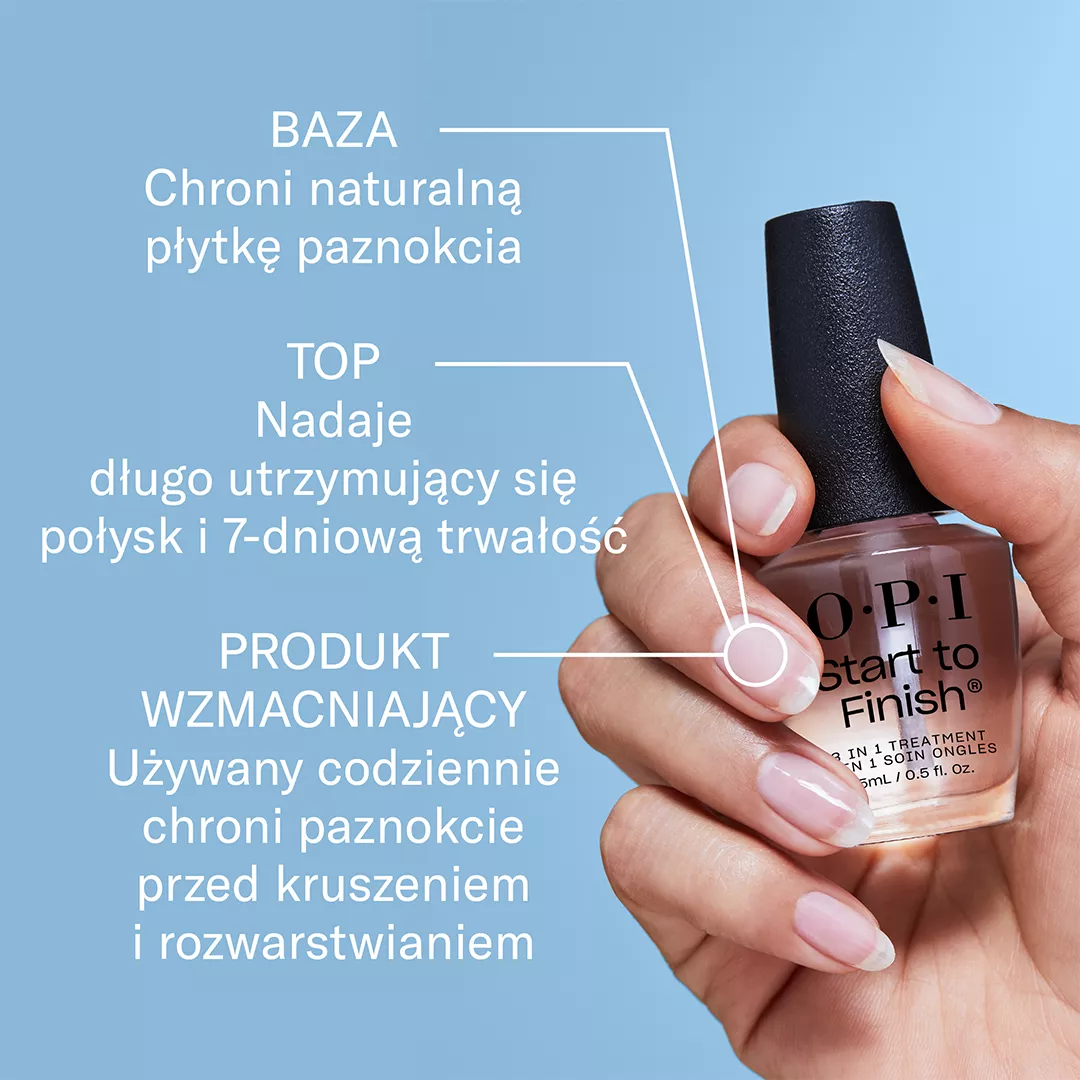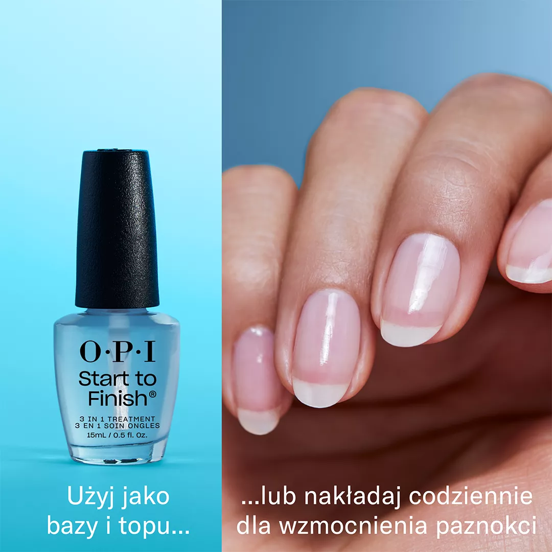 Kuracja 3w1 Start To Finish to wyjątkowy produkt, który może służyć jako baza, top coat lub odżywka do codziennego stosowania. Nakładaj go na czyste, niepomalowane paznokcie, aby cieszyć się pełnymi korzyściami pielęgnacyjnymi.