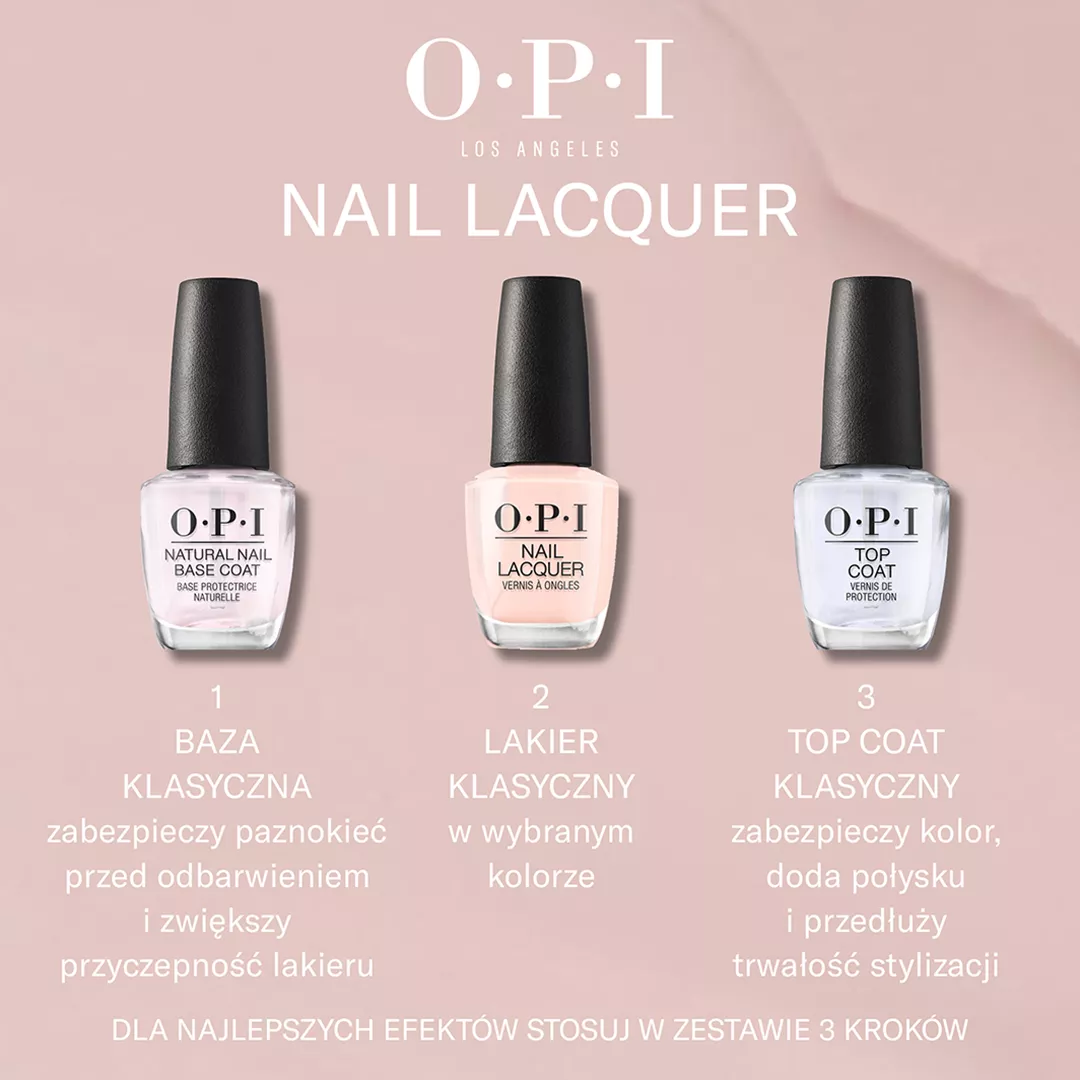 Aby uzyskać najlepsze rezultaty, nałóż lakier OPI Nail Lacquer na jedną z baz OPI, dopasowaną do potrzeb Twoich paznokci. Aplikuj dwie cienkie warstwy lakieru, pozwalając każdej z nich dokładnie wyschnąć. Na zakończenie użyj Top Coat OPI, aby zabezpieczyć kolor i przedłużyć trwałość stylizacji.