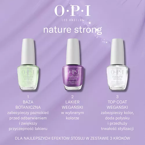 Aby uzyskać najlepsze rezultaty, nakładaj lakier OPI Nature Strong na bazę botaniczną OPI. Nałóż dwie cienkie warstwy lakieru w wybranym kolorze, pozwalając wyschnąć każdej z nich. Dla zabezpieczenia koloru i przedłużenia trwałości stylizacji, na koniec nałóż wegański Top Coat OPI.
