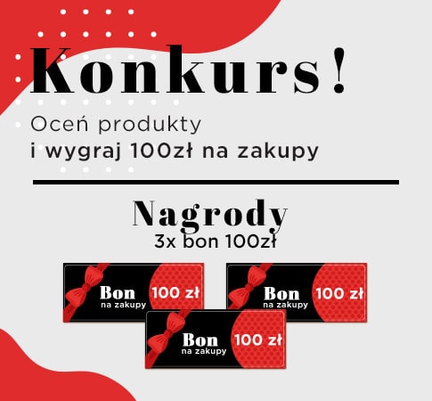• Nagroda w postaci kodu rabatowego o wartości 100 zł wysyłana jest pocztą elektroniczną na podany podczas zakupów adres e-mail. Z laureatami konkursu kontaktujemy się w pierwszy wtorek miesiąca. O wygranej w konkursie informujemy w wiadomości e-mail.