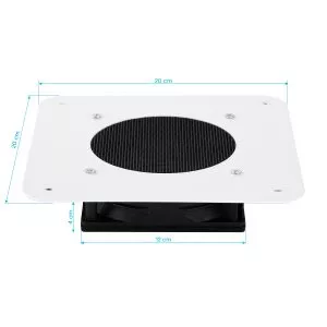 Możliwość zamontowania pochłaniacza bezpośrednio w blacie biurka ułatwia utrzymanie wysokiego poziomu higieny i porządku w miejscu pracy. Taki sposób instalacji sprawia, że urządzenie nie zajmuje dodatkowej przestrzeni, a organizacja stanowiska staje się prostsza i bardziej ergonomiczna. Płaska, biała maskownica z elegancką czarną kratką nie wystaje ponad powierzchnię blatu, dzięki czemu pochłaniacz prezentuje się estetycznie. Prosta konstrukcja oraz minimalistyczne wykończenie podkreślają jego nowoczesny charakter, łącząc funkcjonalność z elegancją.