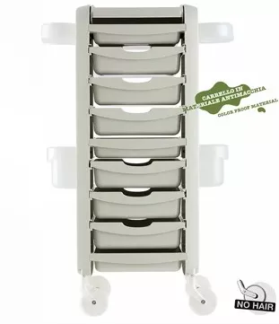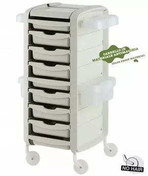 Wyposażone w rewelacyjne, ściągane kółka zabezpieczone przed wkręcaniem się włosów oraz innych zanieczyszczeń. Podwójny, otwierany blat. Trzy szuflady przymocowane na stałe. 6 pojemnych, wysuwanychy szuflad w obu kierunkach z wewnętrznym ogranicznikiem, zapobiegającym rozsypywaniu się zawartości podczas otwierania. 2 uchwyty na suszarkę, prostownice, akcesoria oraz 2 uchwyty ma spryskiwacze.