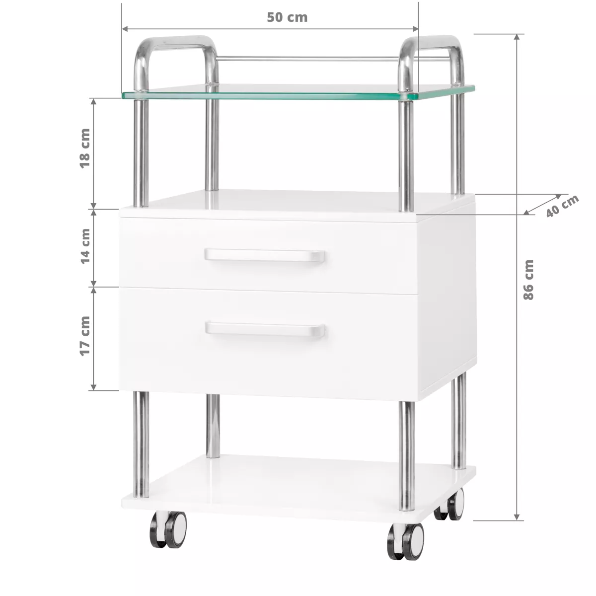 Wykonany z materiałów najwyższej jakości, pomocnik zapewnia stabilność i długą żywotność. Szklany blat jest łatwy do utrzymania w czystości, co jest kluczowe w środowisku medycznym i kosmetycznym.
