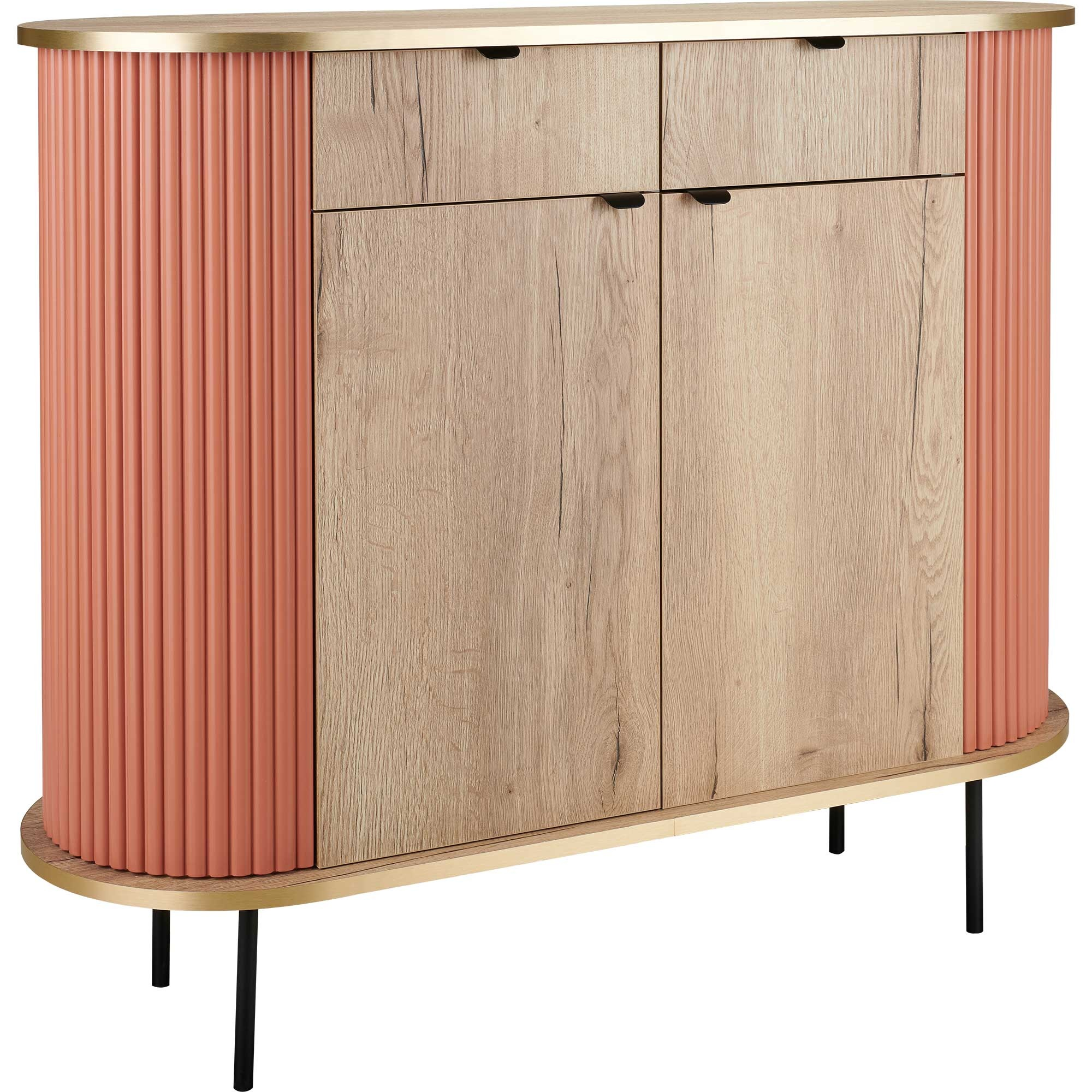 Blat i podstawa są wykonane z płyty meblowej, konstrukcja wykonana z frezowanej, lakierowanej na wzór lameli płyty MDF. Połączenie kilku rożnych struktur tworzy ciekawe połączenie.