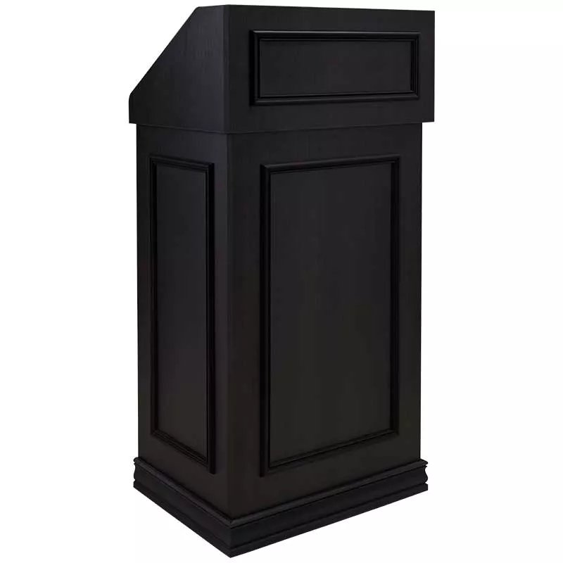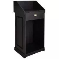 W płycie meblowej w odcieniu bardzo ciemnego wenge, z dekoracyjną sztukaterią na froncie, z podwyższanym frontem, z patynowym uchwytem. Wyposażona w jedną otwartą szafkę i jedną szufladą.
