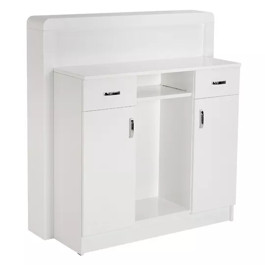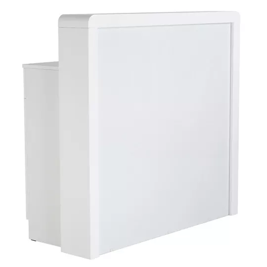 Piękna recepcja z serii Ayala Reflection z podświetlanym frontem, który może być ozdobiony np. logiem salonu. System oświetlenia oparty jest na energooszczędnych diodach LED. Recepcja od strony roboczej wyposażona jest w dwie szafki i szuflady oraz wysuwaną półkę na klawiaturę.