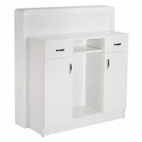 Szafka dostępna w kilkunastu kolorach płyt. Przednia rama w kolorze biały połysk, czarny połysk lub z palety kolorów RAL.