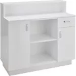 Recepcja wyposażona w dwie zamykane szafki, szufladę oraz 2 półki, dzięki temu zapewnia dużo miejsca na przechowywanie dokumentów i innych potrzebnych w poczekalni rzeczy. front tapicerowany z podświetleniem LED