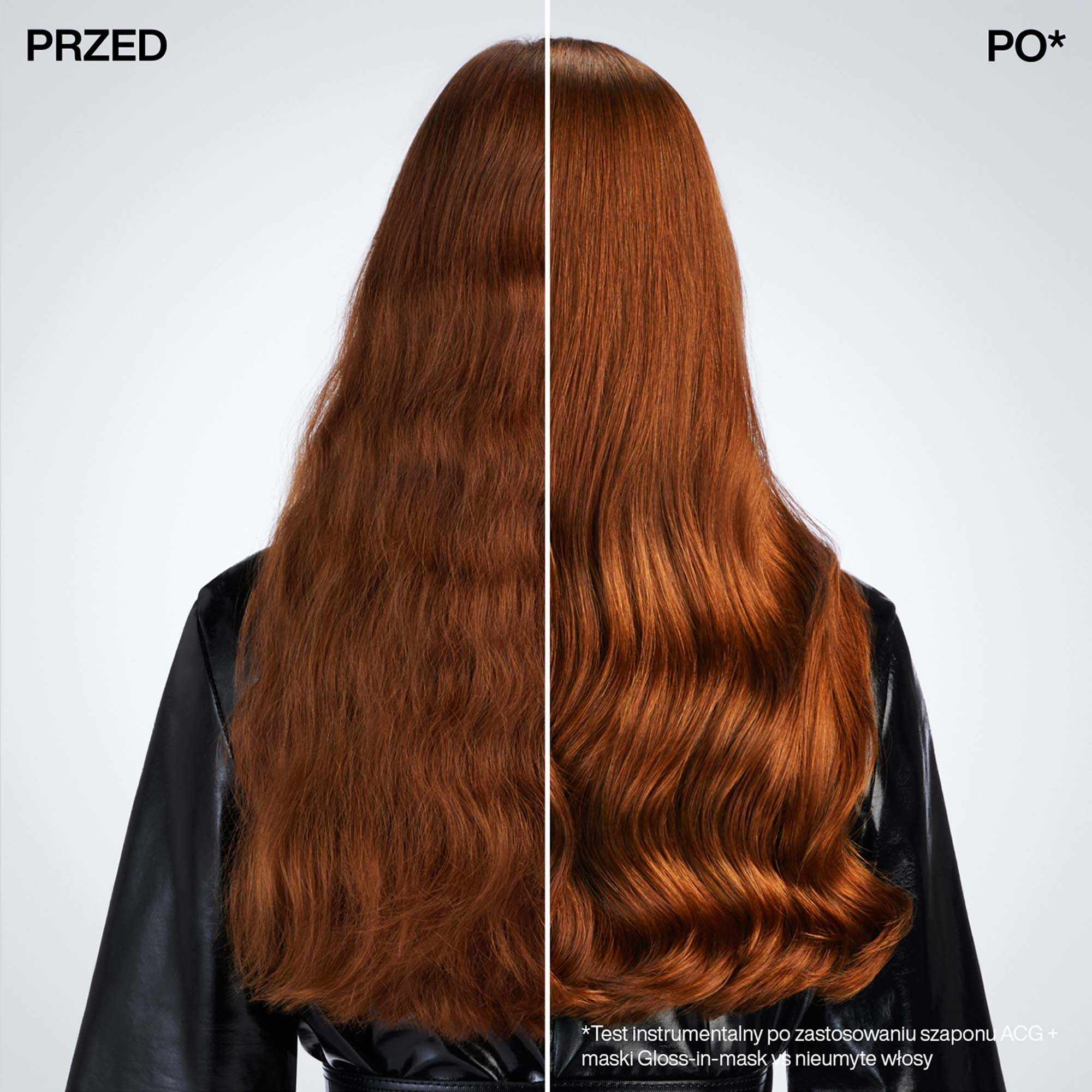 *Test instrumentalny po zastosowaniu systemu Acidic Color Gloss szampon i maska Gloss-in-Mask vs nieumyte włosy.