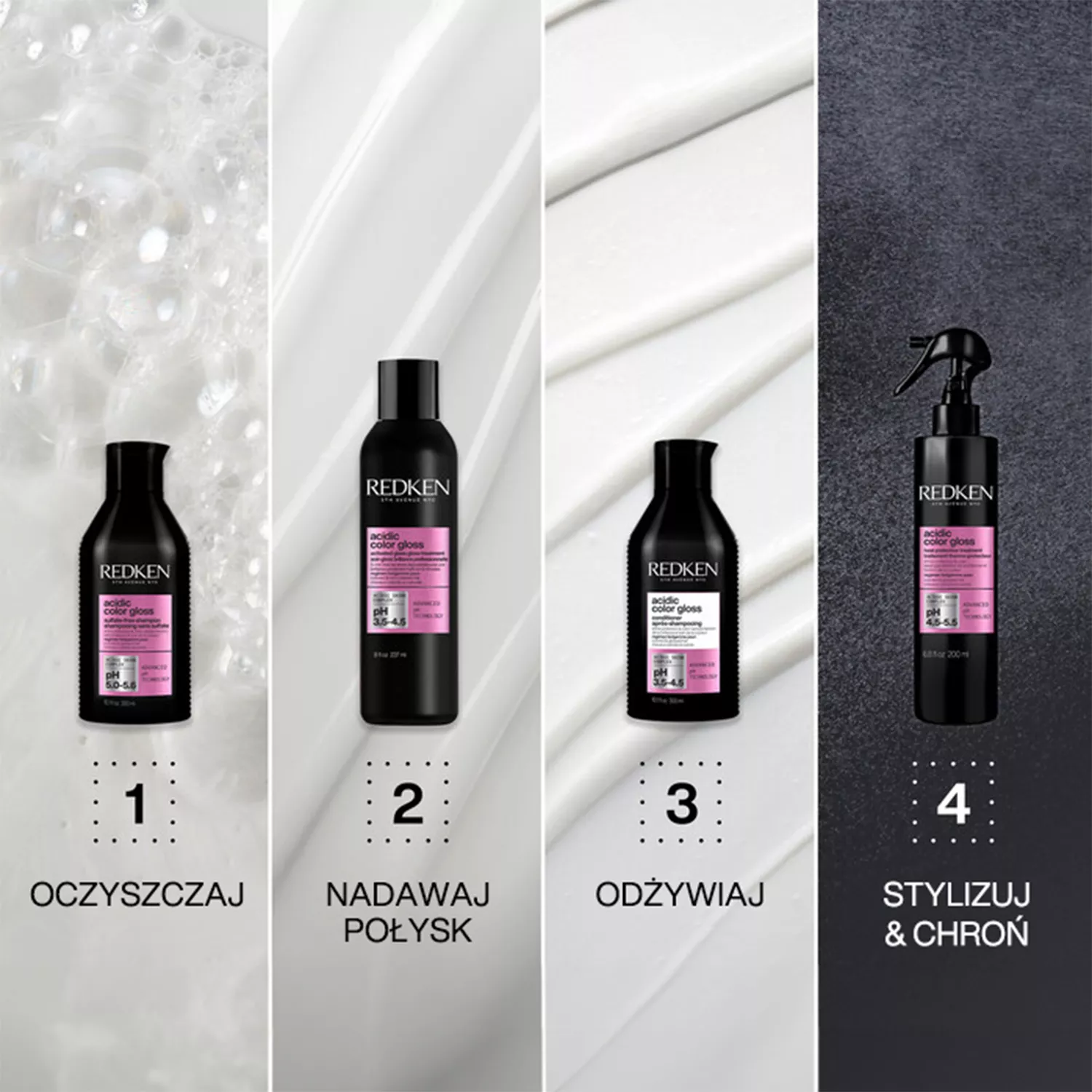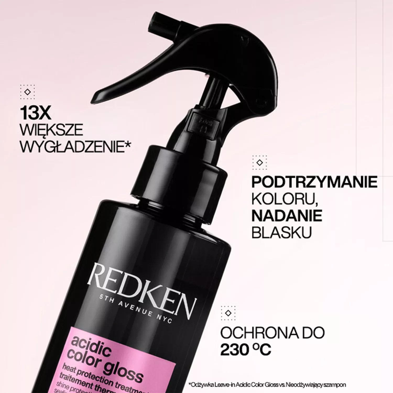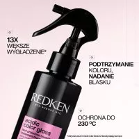 Ochronny spray z serii Acidic Color Gloss od Redken został stworzony specjalnie w celu pielęgnacji i przedłużenia intensywności efektu koloryzacji. Spray do pielęgnacji włosów farbowanych zabezpiecza je przed działaniem wysokiej temperatury oraz zanieczyszczeniami z zewnątrz. Bogata formuła pokrywa włosy bez pozbawiania ich blasku. Zamyka w środku kolor, który na dłużej zachowuje swoją intensywność. Specjalne połączenie regenerującej i odżywiającej witaminy E z działaniem ksylozy tworzy na powierzchni włosów naturalny płaszcz ochronny. Kompozycja składników aktywnych dedykowana włosom farbowanym wygładza je i ułatwia rozczesywanie. Włosy uzyskują połysk z efektem tafli i posiadają tarczę ochronną przed szkodliwym działaniem temperatury i zanieczyszczeń.