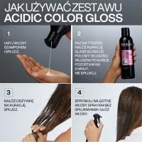 Zaaplikuj spray Acidic Color Gloss na wilgotne, osuszone ręcznikiem włosy. Pozostaw na włosach, nie spłukuj. Stylizuj włosy tak, jak zwykle.