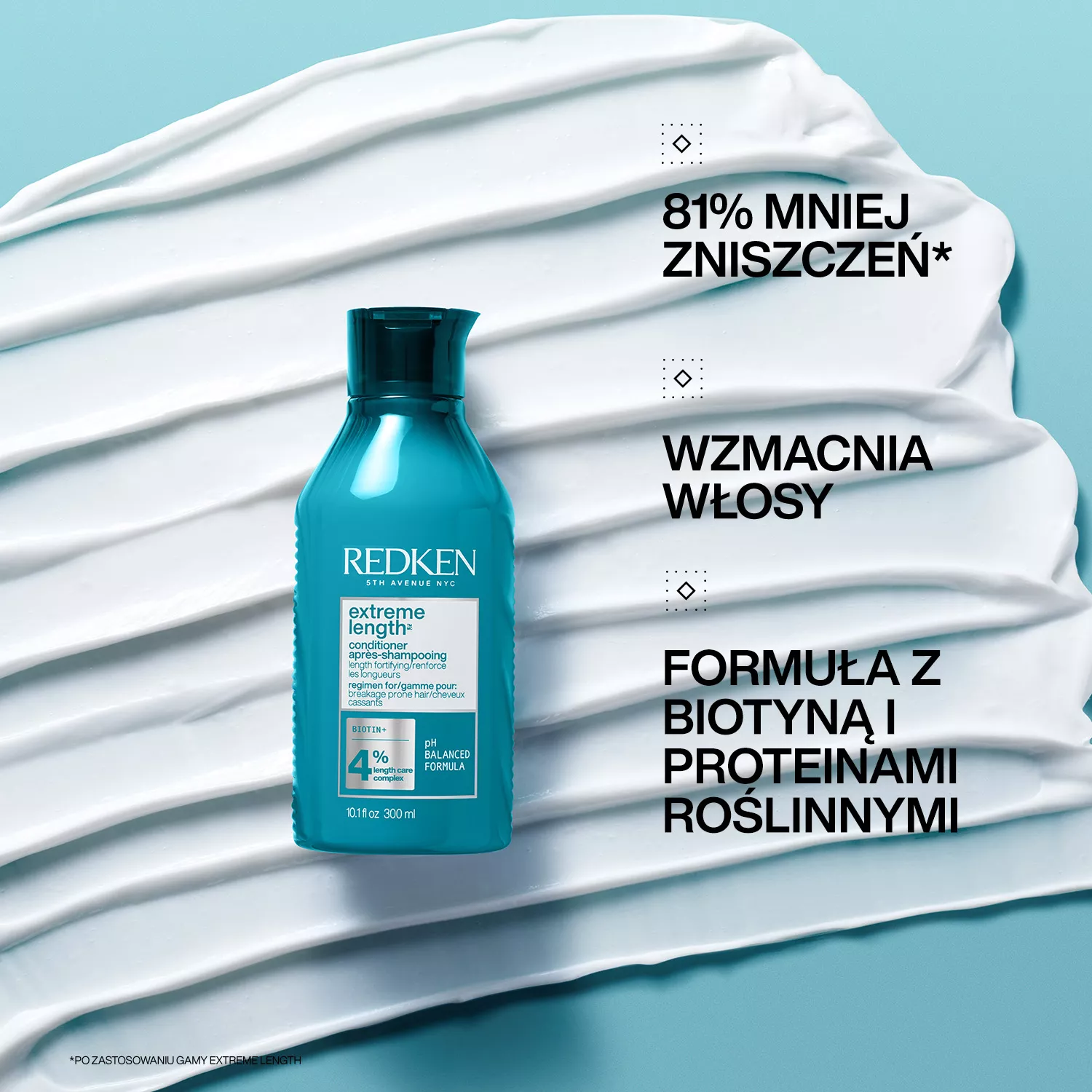 Extreme Length to profesjonalne rozwiązania dla włosów podatnych na zniszczenia. Formuła odżywki zawiera 4% Kompleksu Pielęgnującego Długość z biotyną. Dodatkowo formuła odżywki została wzbogacona o olej rycynowy. Odżywka pielęgnuje włosy na długości i odżywia je. Pomóż swoim klientkom osiągnąć ekstremalnie długie włosy dzięki formułom z biotyną. Przy stosowaniu pełnej rutyny Extreme Length (szampon, odżywka i krem bez spłukiwania) włosy mogą być dłuższe dzięki zredukowaniu złamań aż o 81%*.