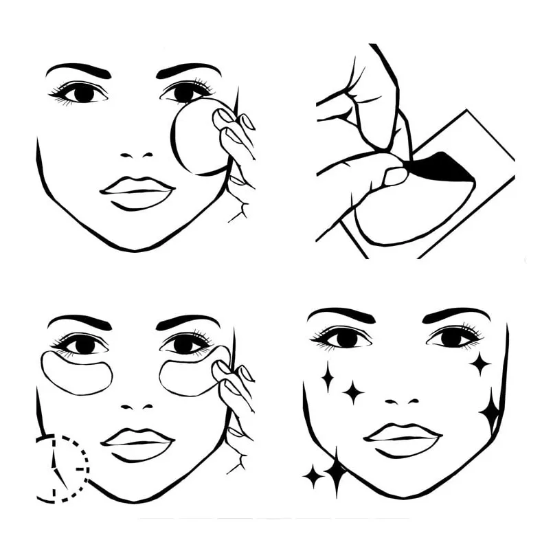 Aby uzyskać najlepsze efekty, usuń plastikowe osłonki z płatków i umieść je pod oczami żelową stroną. Płatki można stosować jako maskę odświeżającą lub jako ochronę podczas stylizacji rzęs. Pozostaw na skórze przez 20-30 minut, a następnie delikatnie zdejmij.