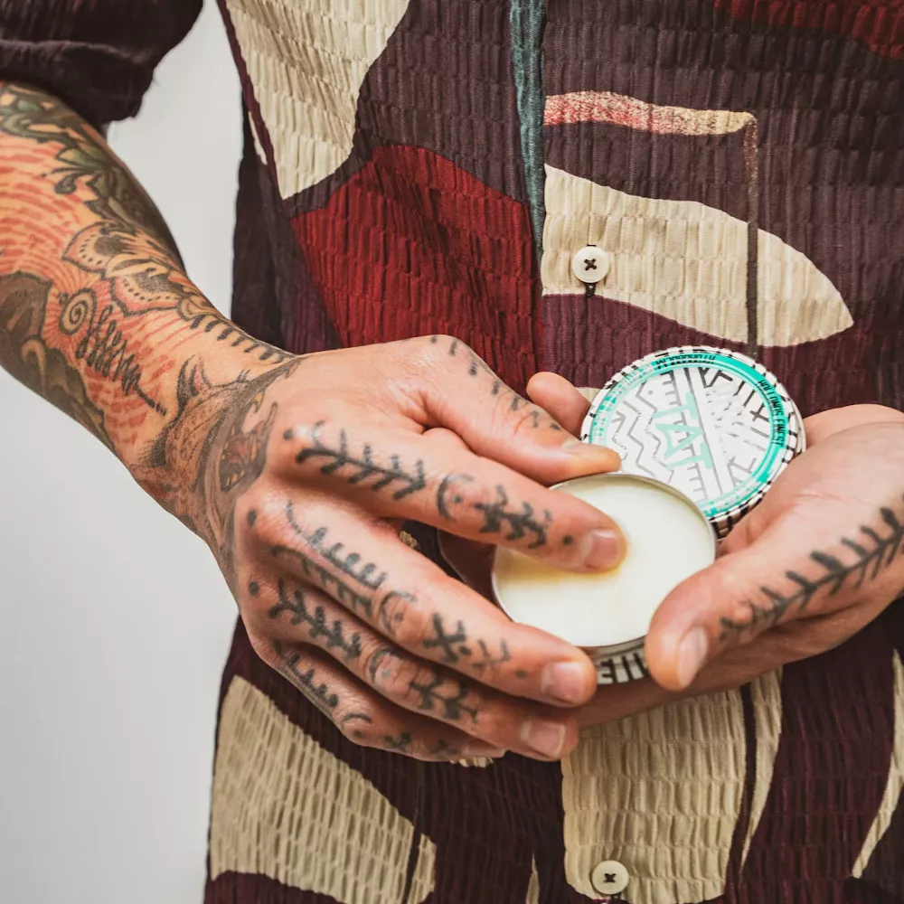 Na czystą skórę aplikuj Reuzel TAT Hydrabalm, delikatnie wmasowując do całkowitego wchłonięcia. Stosuj regularnie, aby cieszyć się pięknem i intensywnością kolorów swoich tatuaży.