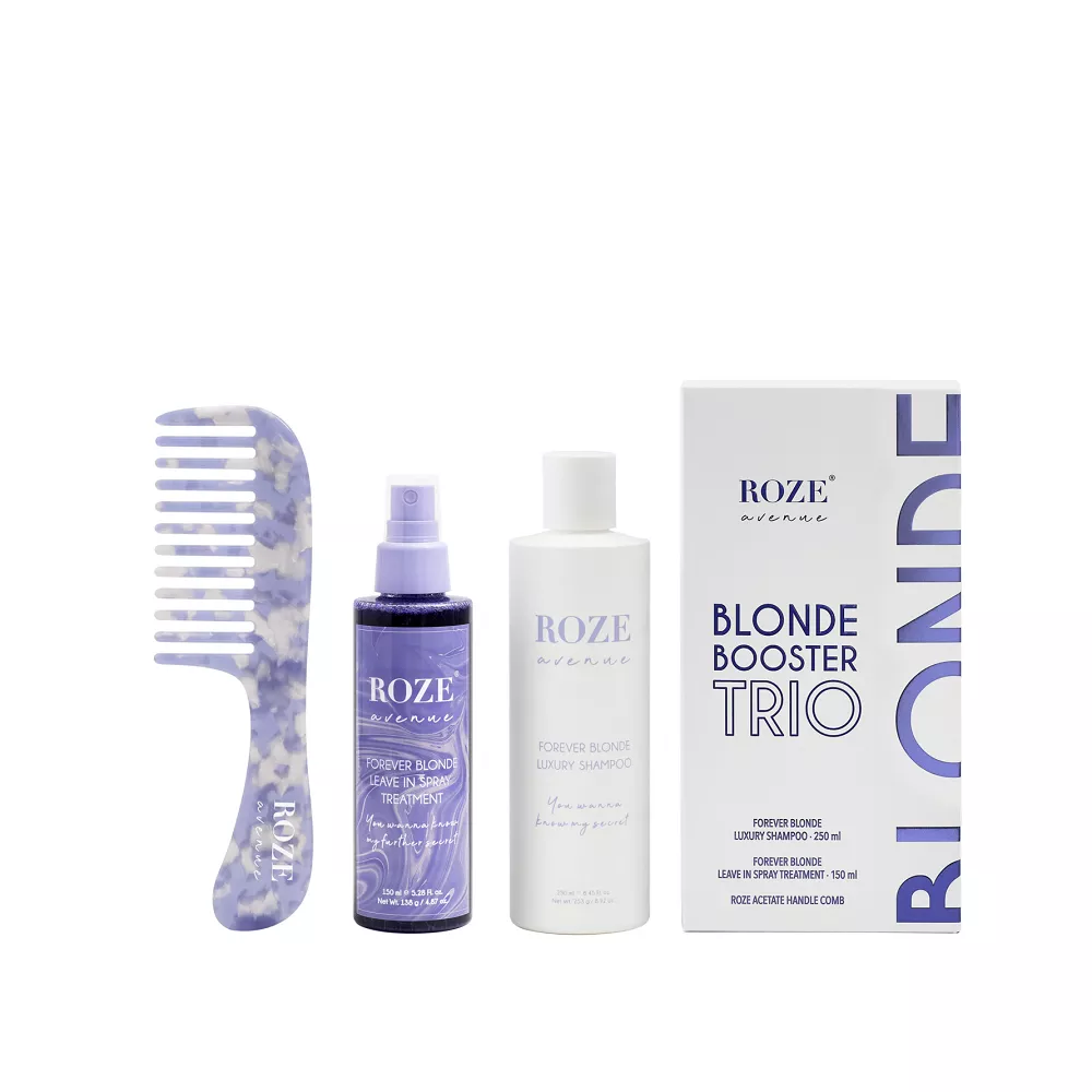Zestaw Blonde Booster Trio firmy Roze Avenue to idealne rozwiązanie dla wszystkich posiadaczek jasnych włosów. Zawiera produkty zapewniające ultra-odżywienie i pomagające pozbyć się żółtych lub pomarańczowych odcieni.