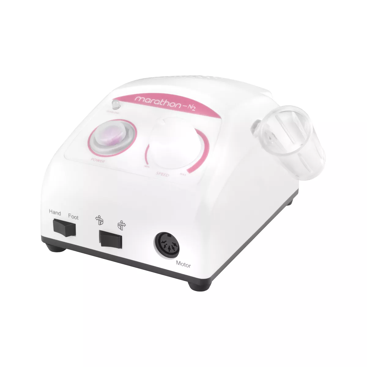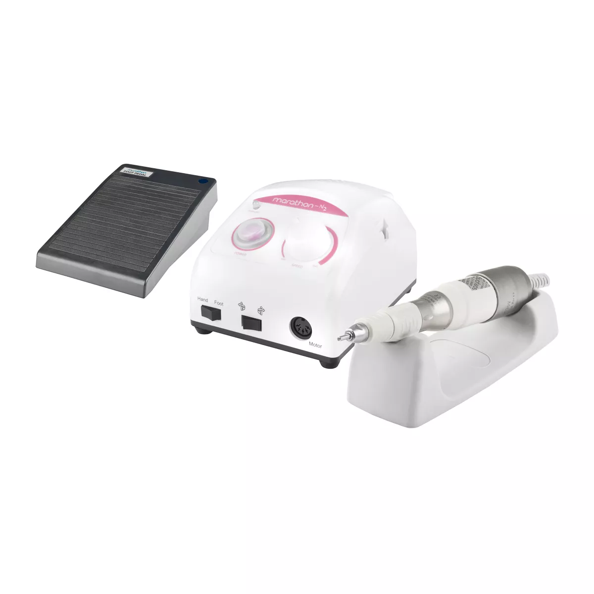 Możesz przełączać obroty na lewe lub prawe. Dioda poinformuje cię o chwilowym przeciążeniu. Możesz podłączyć napęd nożny i sterować nim prędkością (zupełnie jak pedałem gazu w samochodzie). Podczas przerwy głowicę możesz postawić na silikonowej podstawce lub włożyć do uchwytu. Trzymaj kilka frezów na stojaku w bazie frezarki i łatwo wymieniaj je podczas zabiegu.