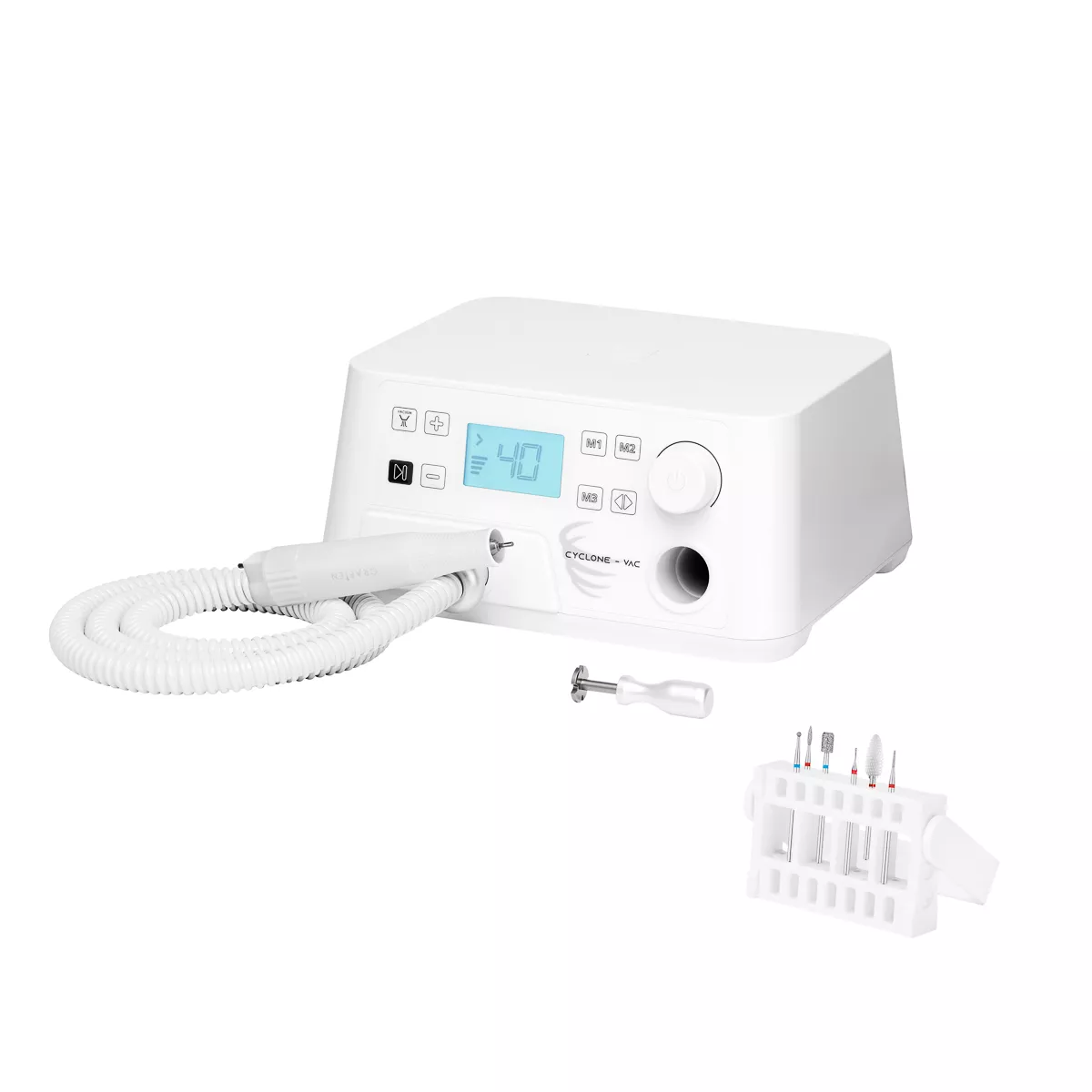 Estetyczna, futurystyczna obudowa w odcieniach bieli doskonale wpasuje się w każde wnętrze. Specjalne miejsce na odłożenie głowicy pozwala na znacznie bardziej komfortową pracę, a antypoślizgowe nóżki zapewniają stabilność urządzenia w trakcie użytkowania. Frezarka z pochłaniaczem Saeyang Cyclone-Vac objęta jest 12-miesięczną gwarancją.