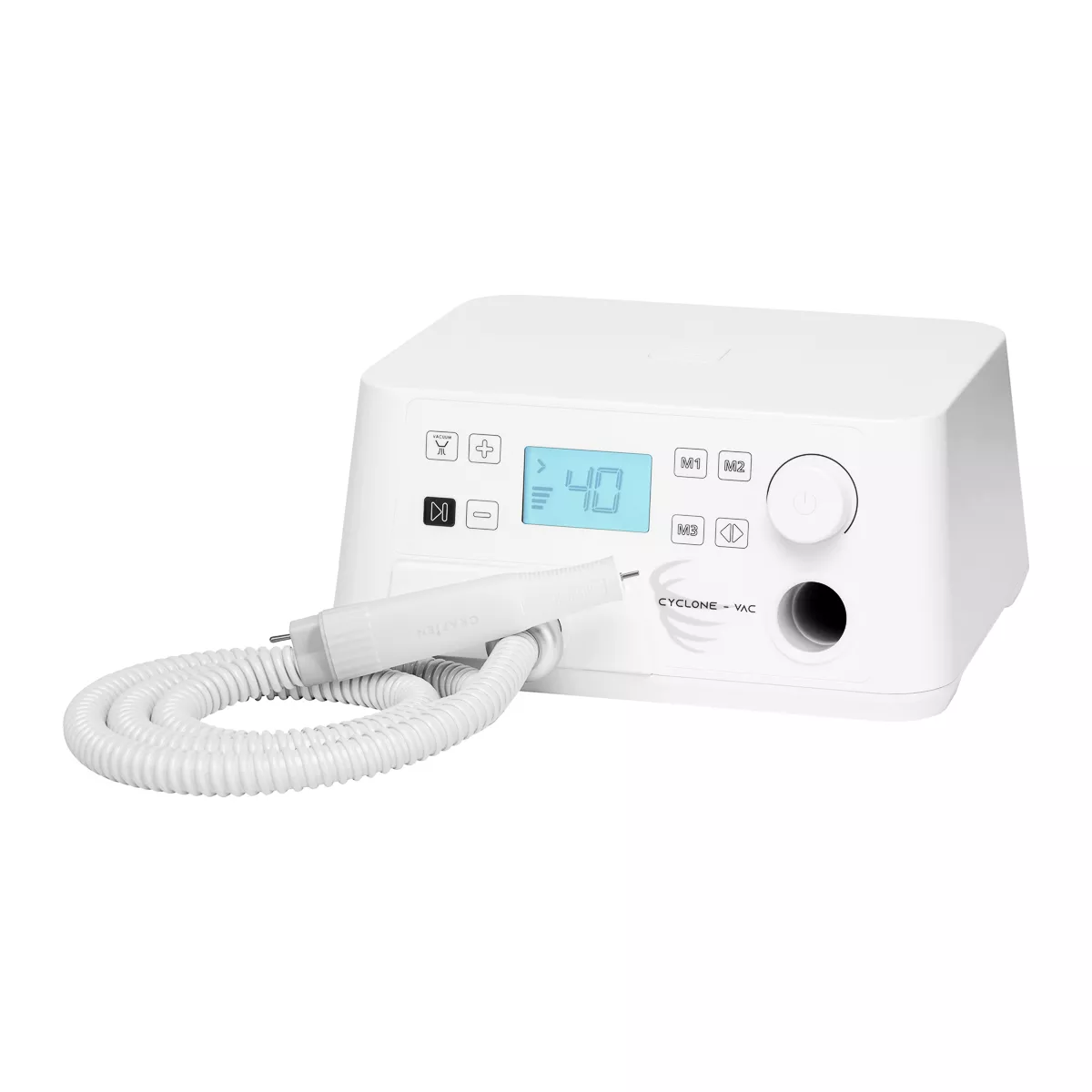 Wysokiej klasy frezarka podologiczna z pochłaniaczem Saeyang Marathon Cyclone-Vac to specjalistyczne urządzenie, które pozwala zachować wysokie standardy higieniczne w gabinecie, efektywnie chroniąc zdrowie osób wykonujących usługi oraz klientów. Profesjonalna frezarka przeznaczona jest do pedicure, zwłaszcza zabiegów leczniczych na sucho przeprowadzanych w podologii, ale sprawdzi się również w trakcie manicure. Wydajna głowica z pochłaniaczem oraz intuicyjna obsługa znacząco usprawniają pracę podologa, ułatwiając wykonywanie szerokiej gamy zabiegów.