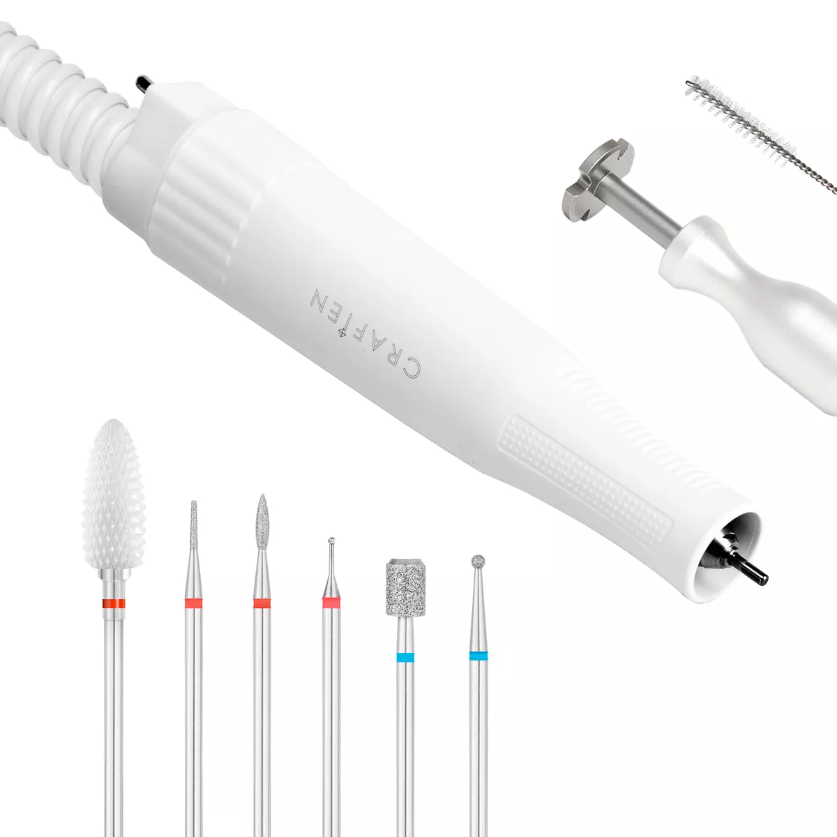 Znajdujące się w zestawie praktyczne akcesoria skutecznie ułatwiają pracę. Precyzyjna głowica z pochłaniaczem oraz zapasowe worki filtrujące zapewniają bezpieczne użytkowanie, chroniąc przed wdychaniem szkodliwych patogenów. W zestawie znajduje się również komplet frezów, który pozwoli na komfortowe wykonywanie różnorodnych zabiegów w zakresie pedicure oraz podstawka wykonana ze specjalnego tworzywa, co ułatwia jej czyszczenie. Różnorodne kształty, materiały oraz gradacje frezów pozwalają dobrać odpowiednie narzędzie do wykonywanej w danym momencie usługi i opracowywanego miejsca. Dołączone narzędzia do czyszczenia głowicy oraz demontażu frezów zapewniają łatwość utrzymania urządzenia w dobrym stanie, ułatwiając korzystanie.