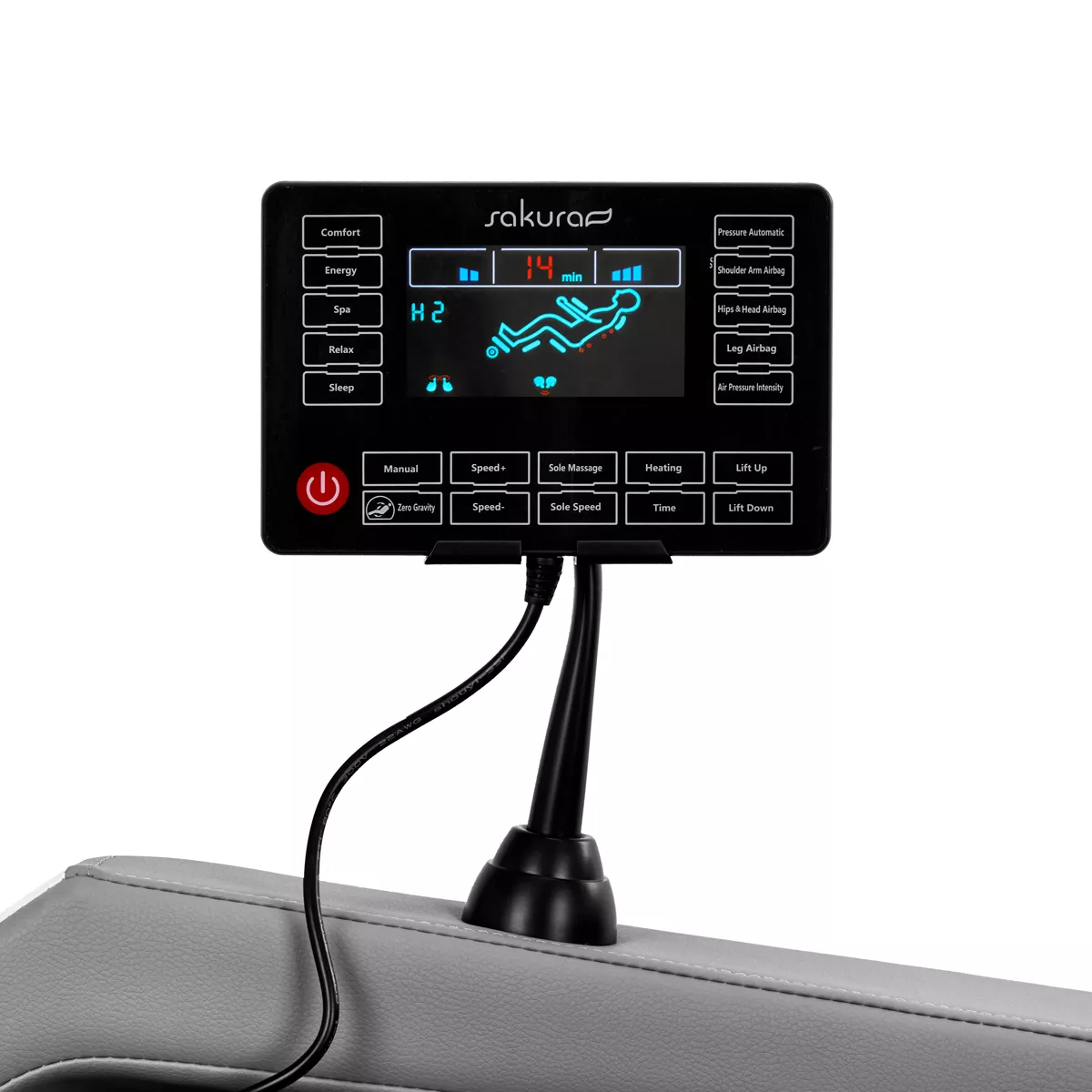 Mebel wyposażony jest w czytelny panel sterowania z ekranem LCD, który można umieścić na uchwycie zamontowanym na prawym podłokietniku lub trzymać w dłoniach. Dzięki temu obsługa fotela jest intuicyjna i wygodna. Na ekranie LCD wyświetlane są informacje o bieżącej pracy urządzenia, w tym masowany obszar ciała, intensywność masażu, czas zabiegu oraz wybrany program. Panel pozwala na swobodne dostosowywanie ustawień fotela oraz wyboru trybu masażu. Pozwala także na regulację czasu trwania sesji, z opcjami 5, 10, 15, 20, 25 lub 30 minut.