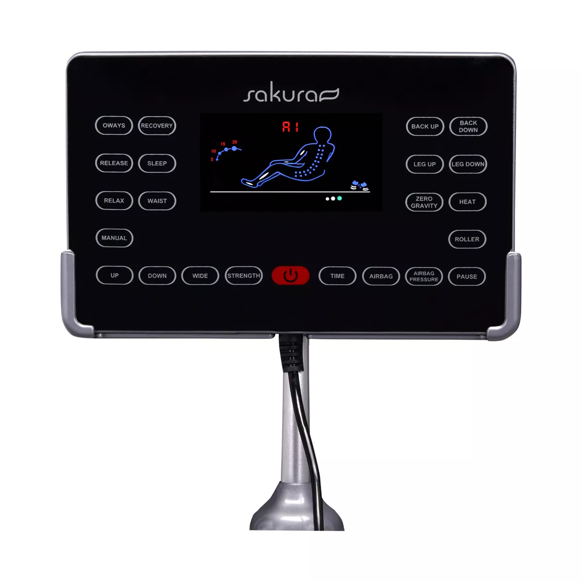 Przejrzysty panel sterowania – który możemy umieścić na uchwycie zamontowanym na prawym podłokietniku bądź trzymać w dłoniach – sprawia, że korzystanie z fotela jest proste i przyjemne. Na czytelnym ekranie można śledzić aktualny przebieg pracy urządzenia. Wyświetlane są wyraźnie konkretne obszary ciała, na których w danym momencie wykonywany jest masaż, jego intensywność, czas trwania zabiegu oraz wybrany program. Panel pozwala na swobodne dostosowywanie ustawień fotela oraz funkcji masażu, a także ustalenie czasu trwania zabiegu, który może trwać 5, 10, 15, 20, 25 lub 30 minut. W łatwy sposób można dostosować również siłę masażu głowicami oraz poduszkami powietrznymi w 5 poziomach.