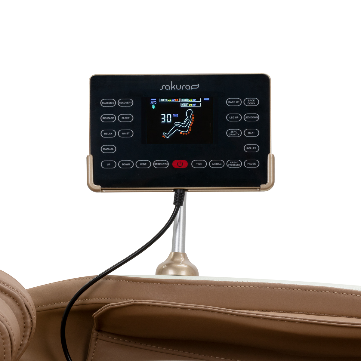 Intuicyjny panel sterowania sprawia, że obsługa fotela jest wyjątkowo prosta i komfortowa. Dla większej wygody można umieścić go w uchwycie na prawym podłokietniku lub trzymać swobodnie w dłoniach. Na czytelnym ekranie LCD wyraźnie prezentowane są wszystkie kluczowe informacje – aktualnie masowane partie ciała, intensywność masażu, czas trwania zabiegu oraz wybrany program. Za pomocą panelu można z łatwością wybierać spośród dostępnych trybów masażu, dostosowywać ustawienia fotela, regulować intensywność działania, a także ustalać czas sesji, który może wynosić 5, 10, 15, 20, 25 lub 30 minut.