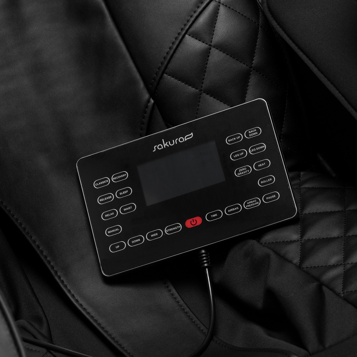 Intuicyjny panel sterowania sprawia, że obsługa fotela jest wyjątkowo prosta i komfortowa. Dla większej wygody można umieścić go w uchwycie na prawym podłokietniku lub trzymać swobodnie w dłoniach. Na czytelnym ekranie LCD wyraźnie prezentowane są wszystkie kluczowe informacje – aktualnie masowane partie ciała, intensywność masażu, czas trwania zabiegu oraz wybrany program. Za pomocą panelu można z łatwością wybierać spośród dostępnych trybów masażu, dostosowywać ustawienia fotela, regulować intensywność działania, a także ustalać czas sesji, który może wynosić 5, 10, 15, 20, 25 lub 30 minut.