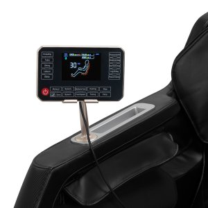 Czytelny ekran LCD i przejrzysty układ przycisków sprawiają, że obsługa fotela jest intuicyjna i wygodna. Panel można umieścić w uchwycie na prawym podłokietniku lub trzymać w dłoni, co zapewnia pełną swobodę sterowania. Na wyświetlaczu prezentowane są informacje o aktualnie masowanej partii ciała, intensywności masażu, czasie trwania sesji oraz wybranym programie. Użytkownik ma możliwość regulacji pozycji fotela, wyboru trybu masażu i ustawienia czasu trwania sesji: 15, 20, 25 lub 30 minut.