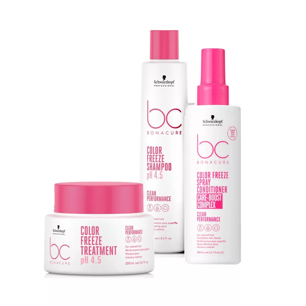 Seria Schwarzkopf BC Color Freeze przywraca włosom odpowiednie pH i dba o to, żeby kolor włosów farbowanych nie matowiał i nie wypłukiwał się szybko. Dodatkowo zestaw kosmetyków BC Color Freeze dba o dobrą kondycję pasm i wzmacnia je po zabiegu chemicznym. Technologia równowagi pH 4.5 to sekret tej serii: kwas mlekowy i wodorotlenek wapnia mają działanie wzmacniające oraz przywracają włosom optymalne pH. Dzięki temu zamykają pigmenty kolory i zapobiegają blaknięciu włosów.