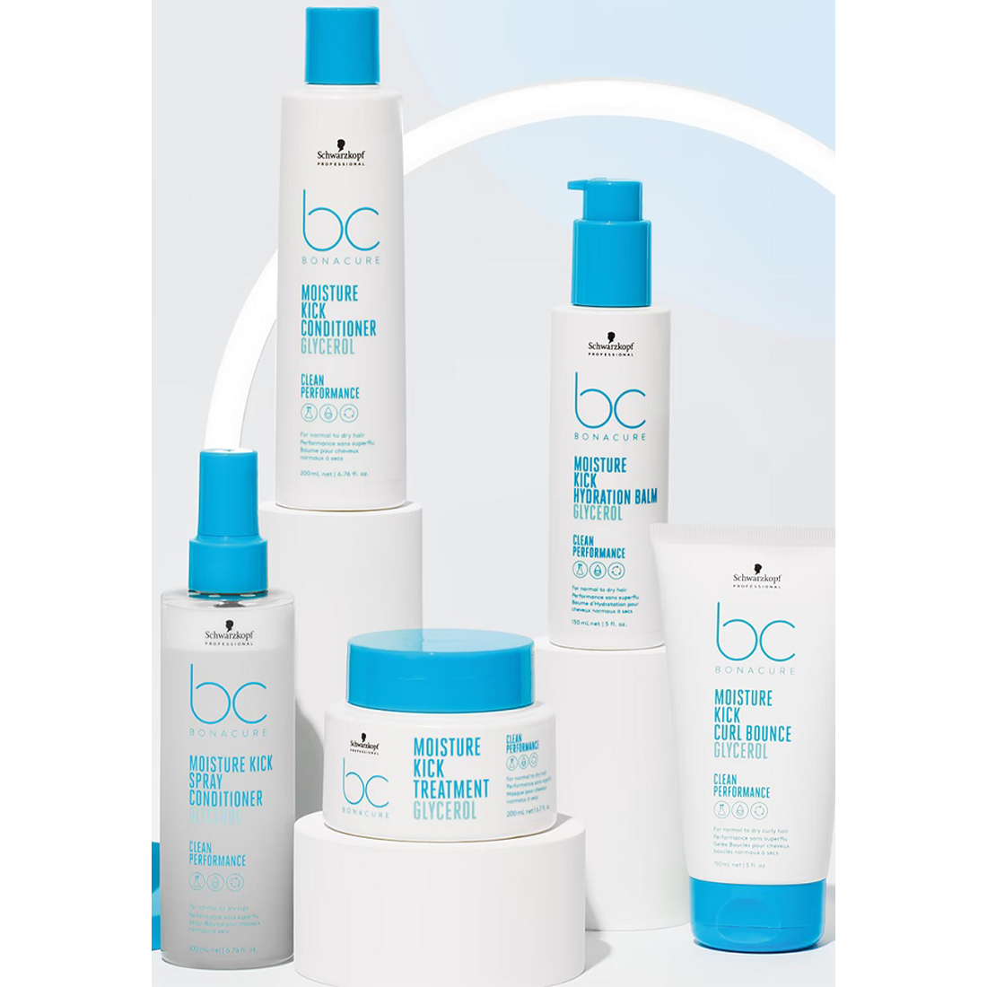 Seria Bonacure Moisture Kick to gwarancja głębokiego nawilżenia i większej elastyczności włosów. Dzięki zawartości gliceryny, produkty z tej linii przywracają odpowiedni poziom nawilżenia zarówno włosom, jak i skórze głowy. Kosmetyki są wolne od siarczanów, silikonów, parabenów, olejów mineralnych, mikroplastiku i sztucznych barwników, co czyni je idealnym wyborem dla osób poszukujących czystych, wegańskich produktów do pielęgnacji włosów. Opakowania są przyjazne dla środowiska i wykonane do 97% z przetworzonego plastiku.