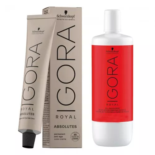Farba do włosów w zestawie z developerem Schwarzkopf Igora Royal Absolutes przeznaczona jest do głownie do włosów dojrzałych. Dzięki nowoczesnej technologii farba również dba o kondycje włosów i sprawia, że są odżywione, mocne i błyszczące. Produkt idealnie kryje siwe włosy. W składzie znajduje się kolagen i siliamina oraz kompleks Pro-Age. Elementy te odbudowują włosy oraz wzmacniają ich strukturę. Produkt jest niskozapachowy, co sprawia, że zabieg koloryzacji jest przyjemniejszy.