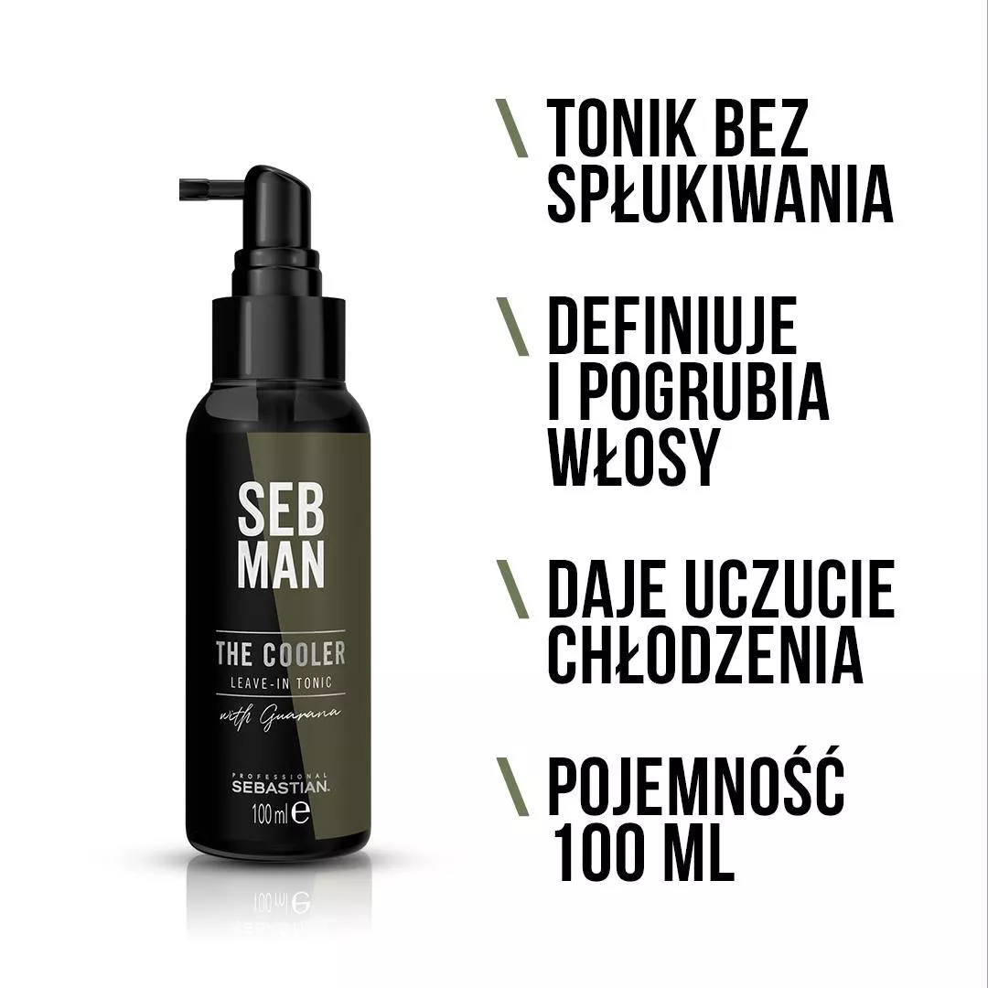 Skład toniku SEB MAN The Cooler: Aqua/Water/Eau, Alcohol Denat., PEG-35 Castor Oil, Panthenol, Parfum/Fragrance, Menthol, Carbomer, Propylene Glycol, Caffeine, Tocopheryl Acetate, Aminomethyl Propanol, Allantoin, Hexyl Cinnamal, Linalool, Coumarin, Limonene, Paullinia Cupana Seed Extract, Aloe Barbadensis Leaf Juice, Citric Acid, Alpha-Isomethyl Ionone, Benzyl Benzoate, Citronellol, Methylparaben, Propylparaben, BHT, Potassium Sorbate, Sodium Benzoate, Sodium Sulfite