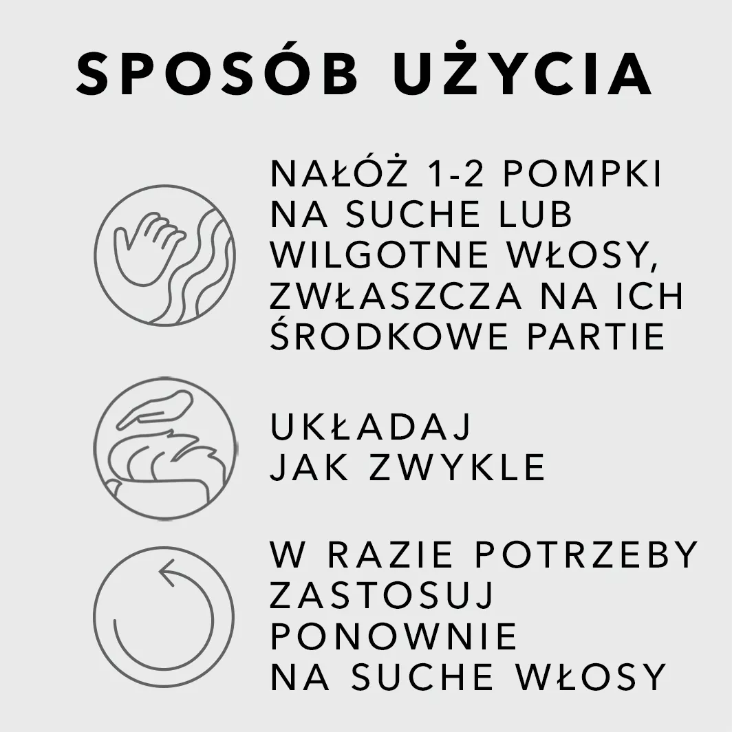 Nałóż 1-2 porcje produktu na suche lub wilgotne włosy. Układaj jak zwykle. W razie potrzeby zastosuj ponownie na suche włosy.