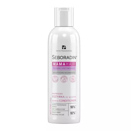 Seboradin Mama Care odżywka ekspresowa 200 ml to innowacyjny kosmetyk stworzony z myślą o potrzebach kobiet w ciąży i mam karmiących piersią. Jej zaawansowana formuła wzmacnia włosy, zapobiega ich łamliwości oraz poprawia ich kondycję już od pierwszego użycia. Odżywka ułatwia rozczesywanie, sprawia, że włosy stają się gładkie, pełne blasku i nawilżone, a jednocześnie nie obciąża fryzury. Produkt został przebadany dermatologicznie oraz oceniony pozytywnie przez kobiety biorące udział w badaniach, co potwierdza jego bezpieczeństwo i skuteczność.
