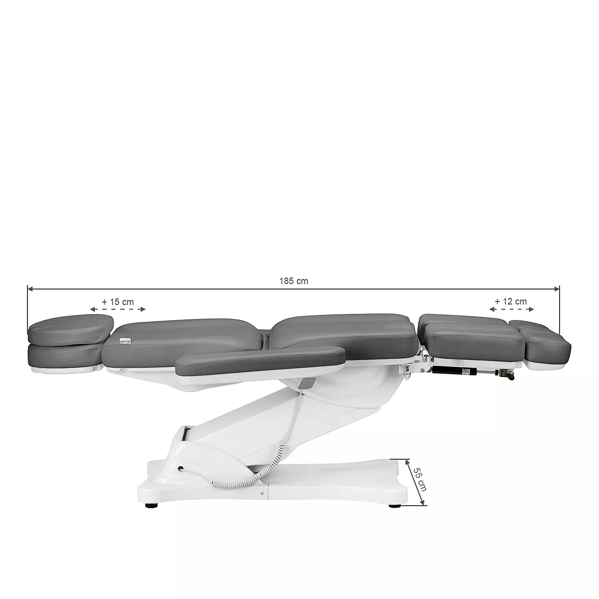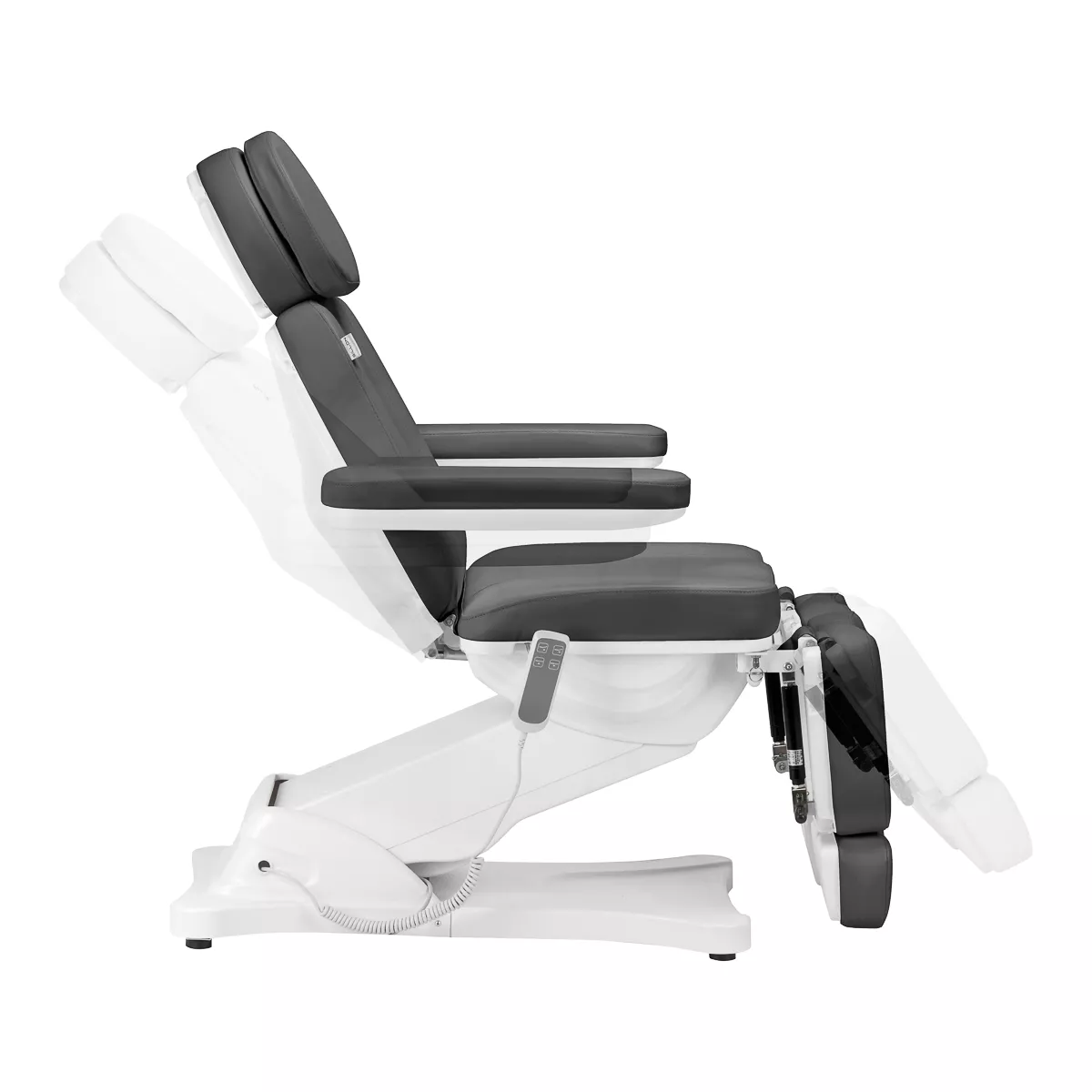 Przy użyciu prostego w obsłudze pilota fotel płynnie dostosowuje się w 2 płaszczyznach – posiada regulację wysokości oraz oparcia. Siedzisko można ustawić tak, by znajdowało się na wysokości od 61 cm do 84 cm, a przy całkowitym rozłożeniu fotel osiąga długość 2 m. Wymiary te pozwalają na łatwe korzystanie ze sprzętu osobom o różnym wzroście i umożliwiają dostosowanie go do aktualnie wykonywanego zabiegu oraz indywidualnych potrzeb, co wpływa zarówno na komfort użytkownika, jak i osoby wykonującej usługi. Uchwyty znajdujące się po obu stronach siedziska pozwalają na odwieszenie pilota tak, by znajdował się zawsze pod ręką.