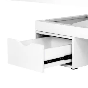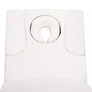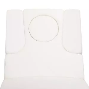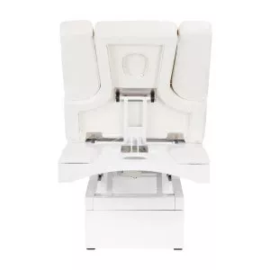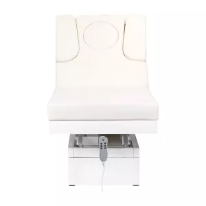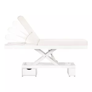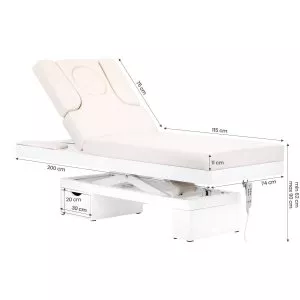 Nowa leżanka kosmetyczna. Absolutny hit wśrod leżanek. Elektryczna regulacja wysokości w bardzo szerokim zakresie 62-90 cm. Oparcie również regulowane za pomocą pilota, od pozycji poziomej do niemal pionu (podnosi się do 80 stopni). Możliwość wysunięcia w bok bądź całkowitego demontażu części bocznych oparcia. W zestawie jest jedna poduszka. W dolnej cześci, pod oparciem, znajduje się szufladka na podręczne akcesoria. Mebel szeroki (76 cm), z grubym i bardzo wygodnym materacem. Leżanka jest bardzo stabilna. Posiada obicie z wysokiej jakości ekoskóry w delikatnym odcieniu ecru.