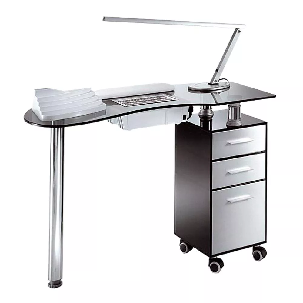 Stylowy stolik do manicure Panda 186 produkcji włoskiej. Posiada w swym wyposażeniu podstawkę na lakiery do paznokci, lampę na biurko, pufkę pod dłoń.