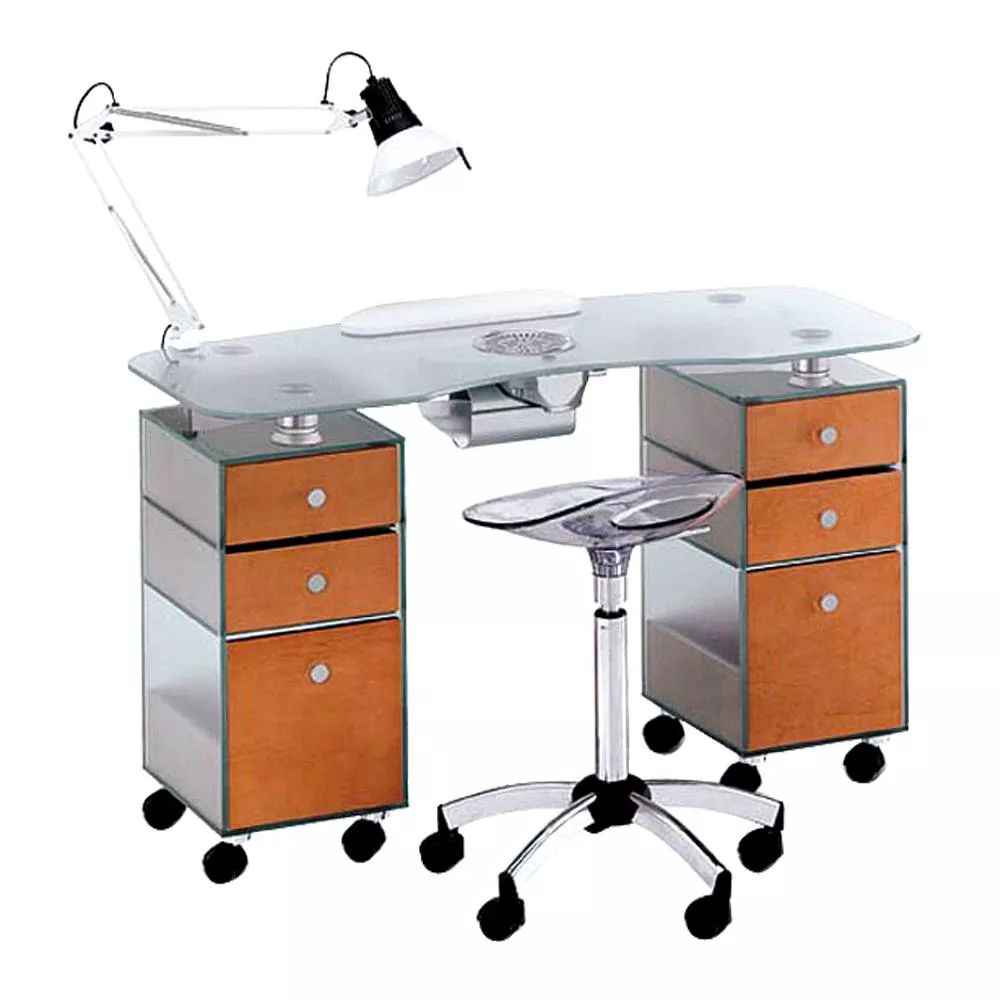 W zestawie z biurkiem znajdują się pochłaniacz pyłu, lampa na biurko, stojak na lakiery i wygodna pufka pod dłoń dla klientki.