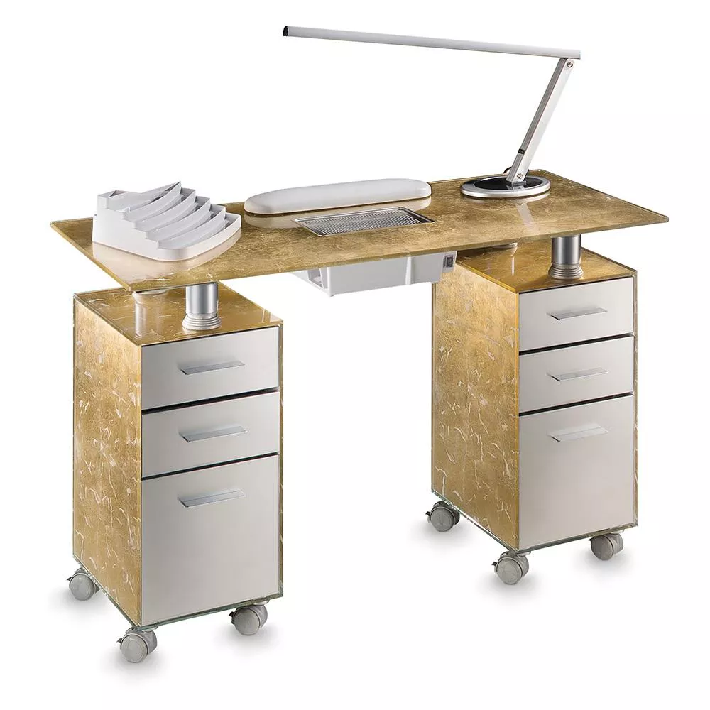 Elegancki stolik do manicure Panda 191 Glass. Blat oraz korpus szafek wykonane są ze szkła hartowanego z motywem złotych liści.
