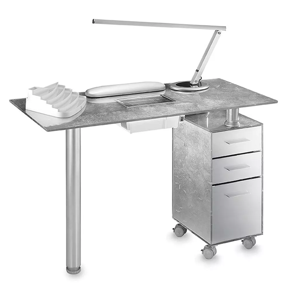 Stolik jest również wyposażony w lampę, wyściełaną podkładkę pod dłonie i prezenter lakierów do paznokci.