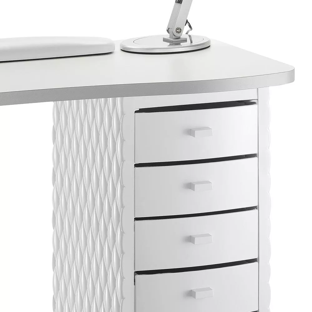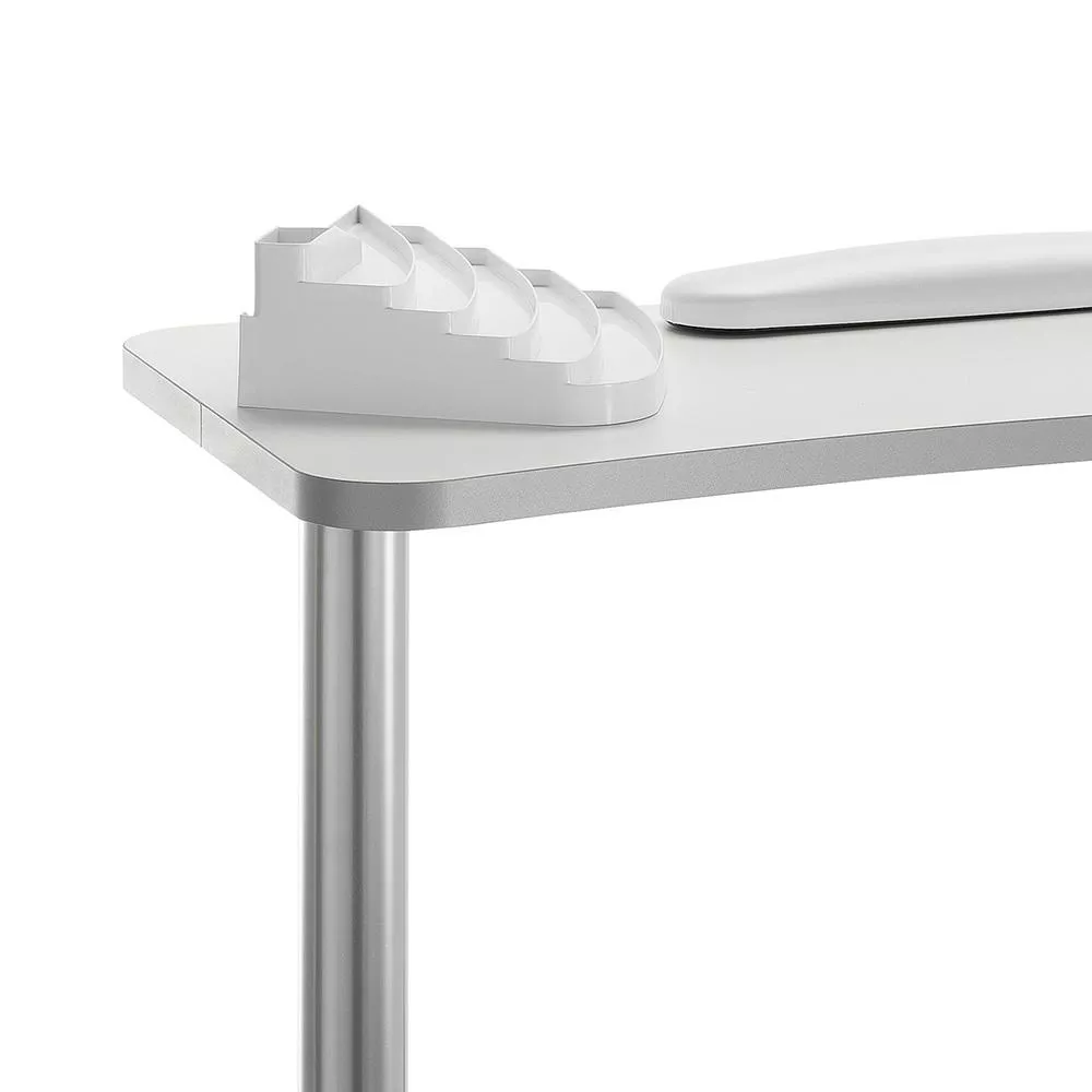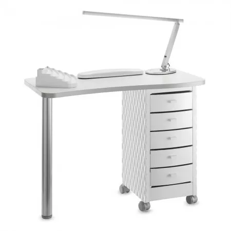 Wraz ze stolikiem otrzymasz nowoczesną lampkę oświetleniową w kolorze srebrnym, wygodną pufkę pod dłoń dla klientki, mobilny stojak pod lakiery do paznokci.