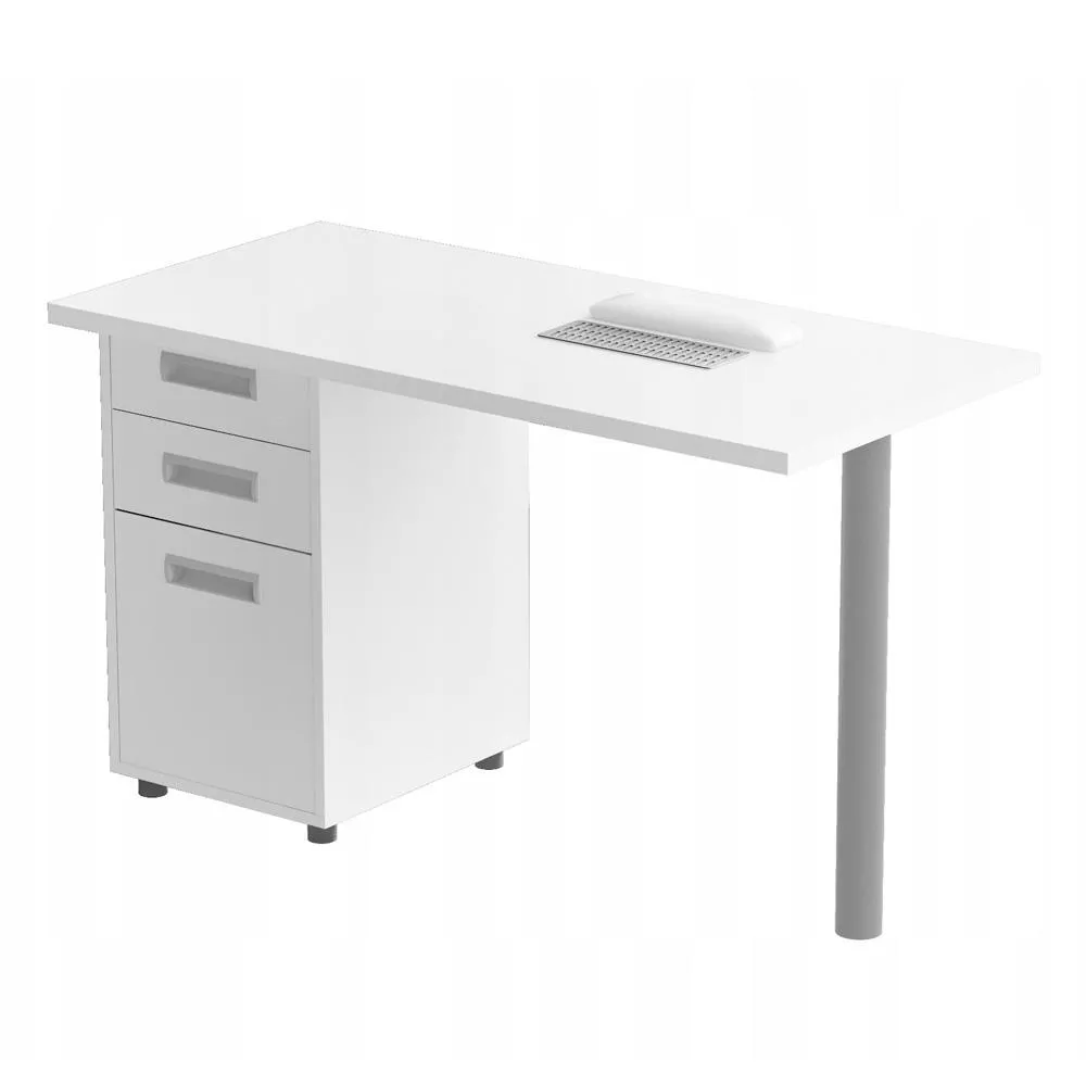 Stolik kosmetyczny do manicure Panda Versa z płytą laminowana, funkcjonalną szafką uchylną oraz dwoma szufladami.