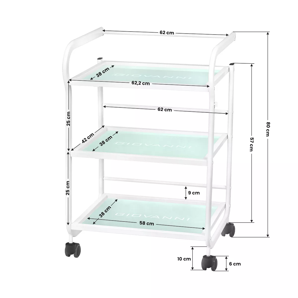 Stolik kosmetyczny typ 1013 Giovanni to nowoczesne i funkcjonalne rozwiązanie stworzone z myślą o profesjonalnych gabinetach kosmetycznych, salonach urody oraz wszystkich, którzy cenią sobie wygodę i estetykę pracy. Solidna konstrukcja z metalu, eleganckie szklane półki oraz praktyczne kółka sprawiają, że ten stolik pod urządzenie kosmetyczne spełni oczekiwania nawet najbardziej wymagających użytkowników.